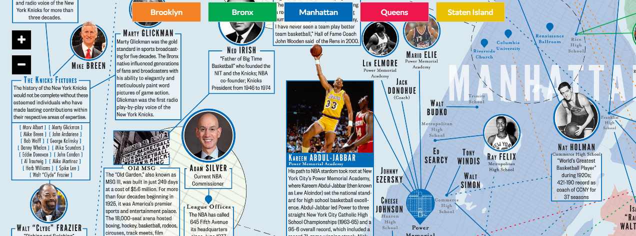 For All-Star weekend, the NBA released an AMO-style interactive map of the history of New York City basketball. The colorful map shows a long history as diverse as the city itself, from prep stars such as Queens’ Bob Cousy and Brooklyn’s Lance Stephenson to the storied histories of the Knicks and Nets.