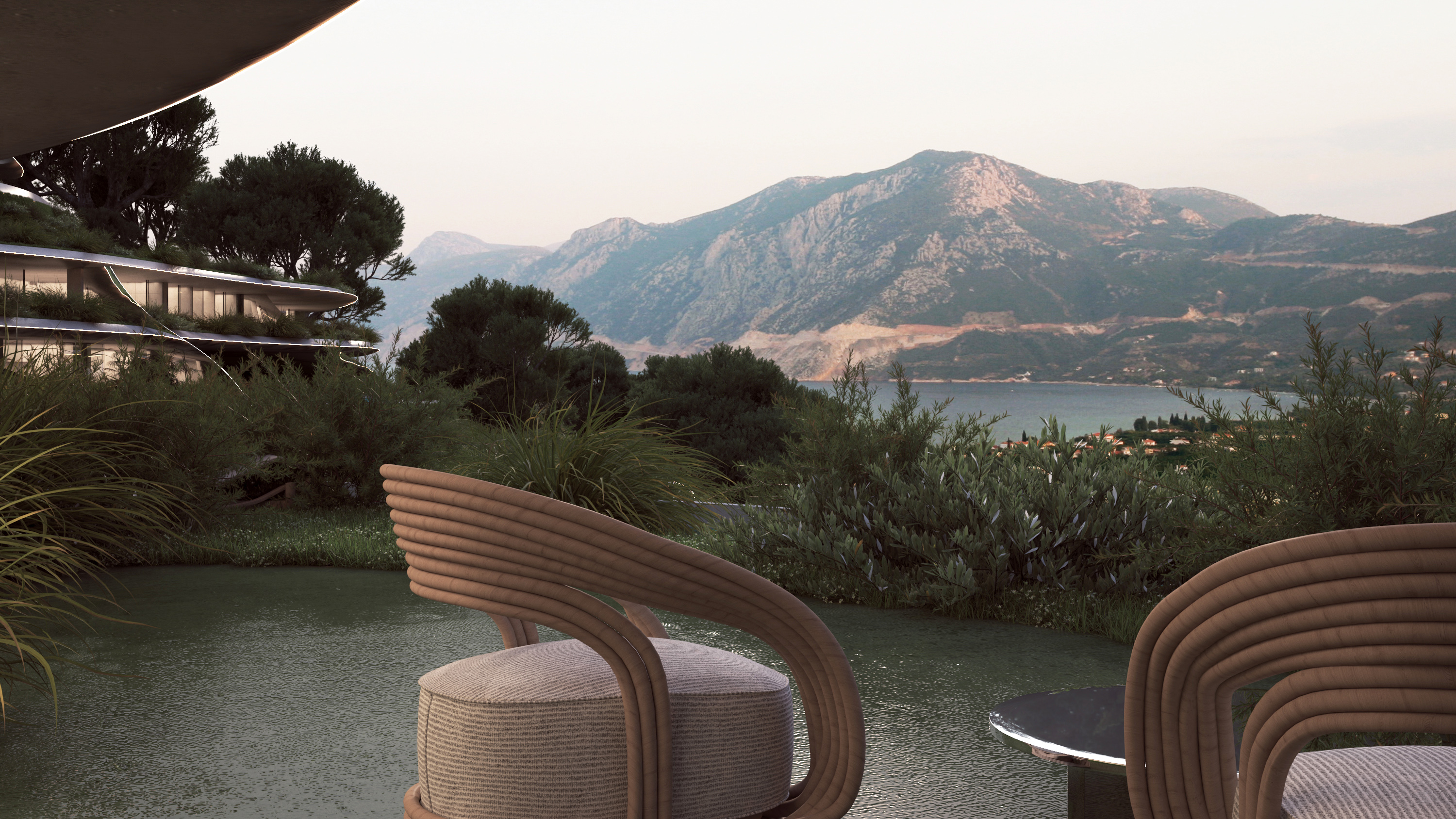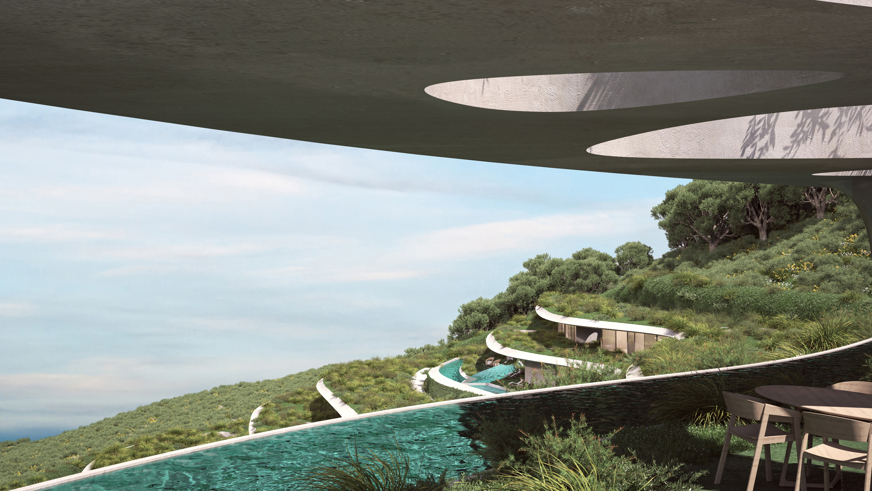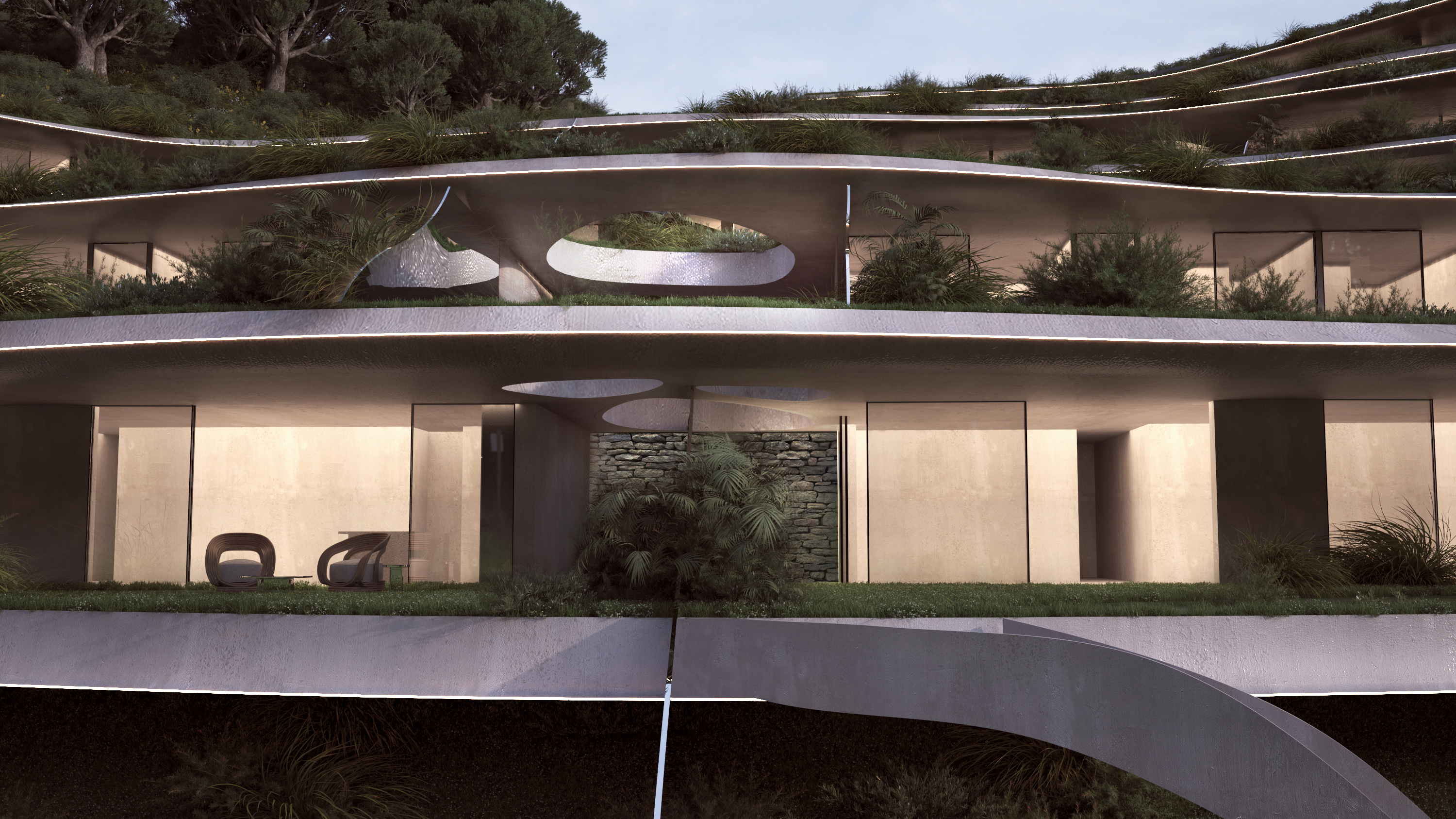 Gods and Dreams Resort – The project was conceived as an extension of the site. The resort in its gesture aims to a continuity with the landscape inspired by the topography. It extends, follows it and grows from it. The resort enhances and maximizes the landscape and its views, through reflections, big openings and direct access points to the landscape. The slender organic strips of the form allow the resort to perch on the terrain. The plantation extends over and all around the resort allowing the strips and the skin that they formulate, to shift in different hues and density. The rooms and living areas are shifted backwards and forwards to ensure private, enclosed spaces and open views of the scenery.