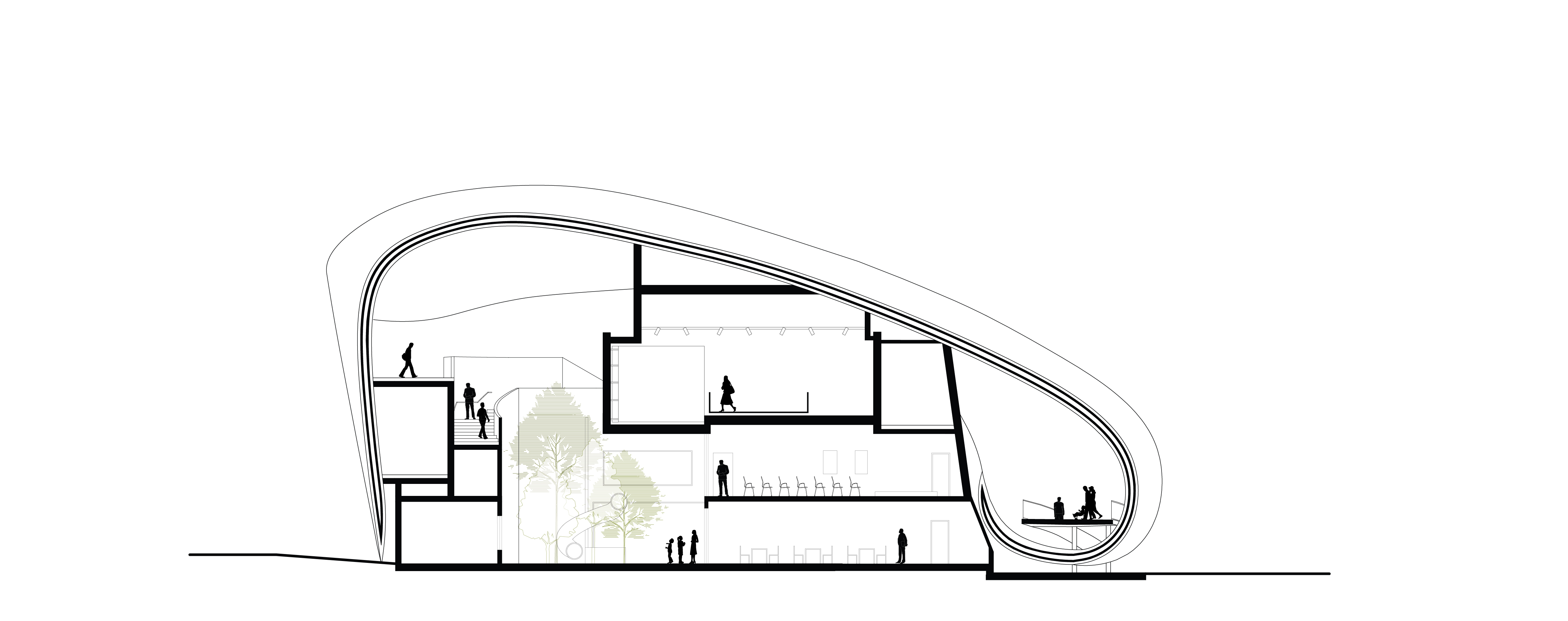 The first floor, accessible directly from the main ramp, is a multi-functional space. To accommodate concerts, receptions, and conferences, the side door remains closed, and the ramp guides visitors along without causing disruptions. When hosting a temporary exhibition, the door serves as a barrier, with the indoor space becoming an intuitive part of the flow.