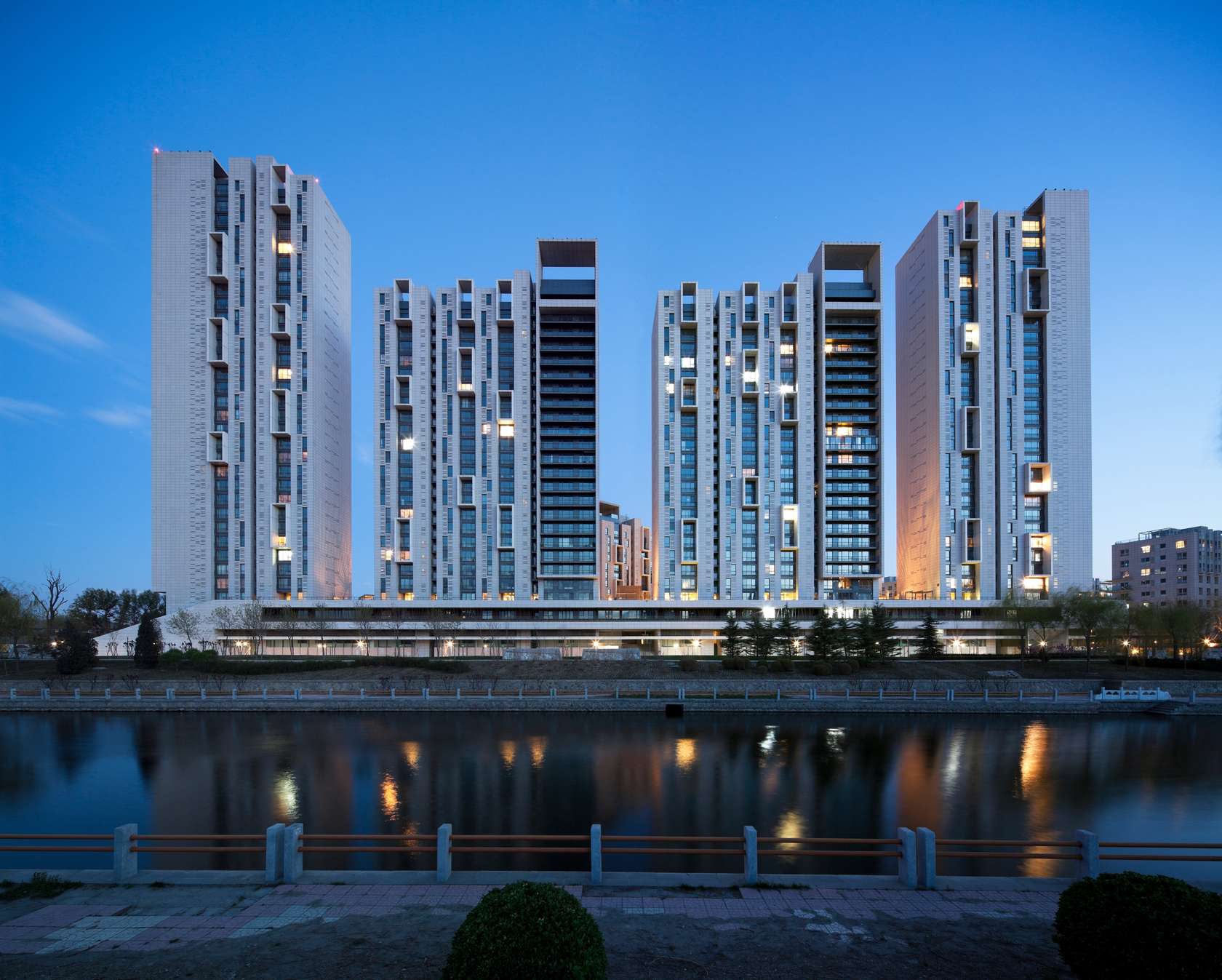 While the raw texture of weathering steel suited the school’s location in Silkeborg, Denmark, Schmidt Hammer Lassen has also illustrated its capability to detail external elevations using more unforgiving, luxury materials: in Shanghai, it clad a series of six slender residential blocks in white Chinese granite, draping the Andersen Garden Housing Complex in a pristine cloak of subtle sophistication.