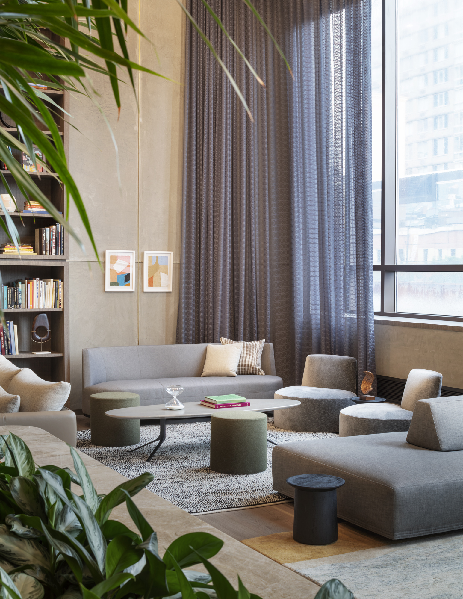 We have several favorite moments, notably the feature stair at the roof level, as well we the 360 degree roof deck. But our favorite intervention is the central landscape element in the main lounge. This design helps to subtly break up the impressive main space into distinct seating groups and social uses. The interior trees also provide a soft and soothing element, and bring a human scale to an otherwise oversized room. We felt it was important to create a transportive space, one where you could take a break from the city’s bustle and find your place, but without losing the grandeur of being in a large public space.