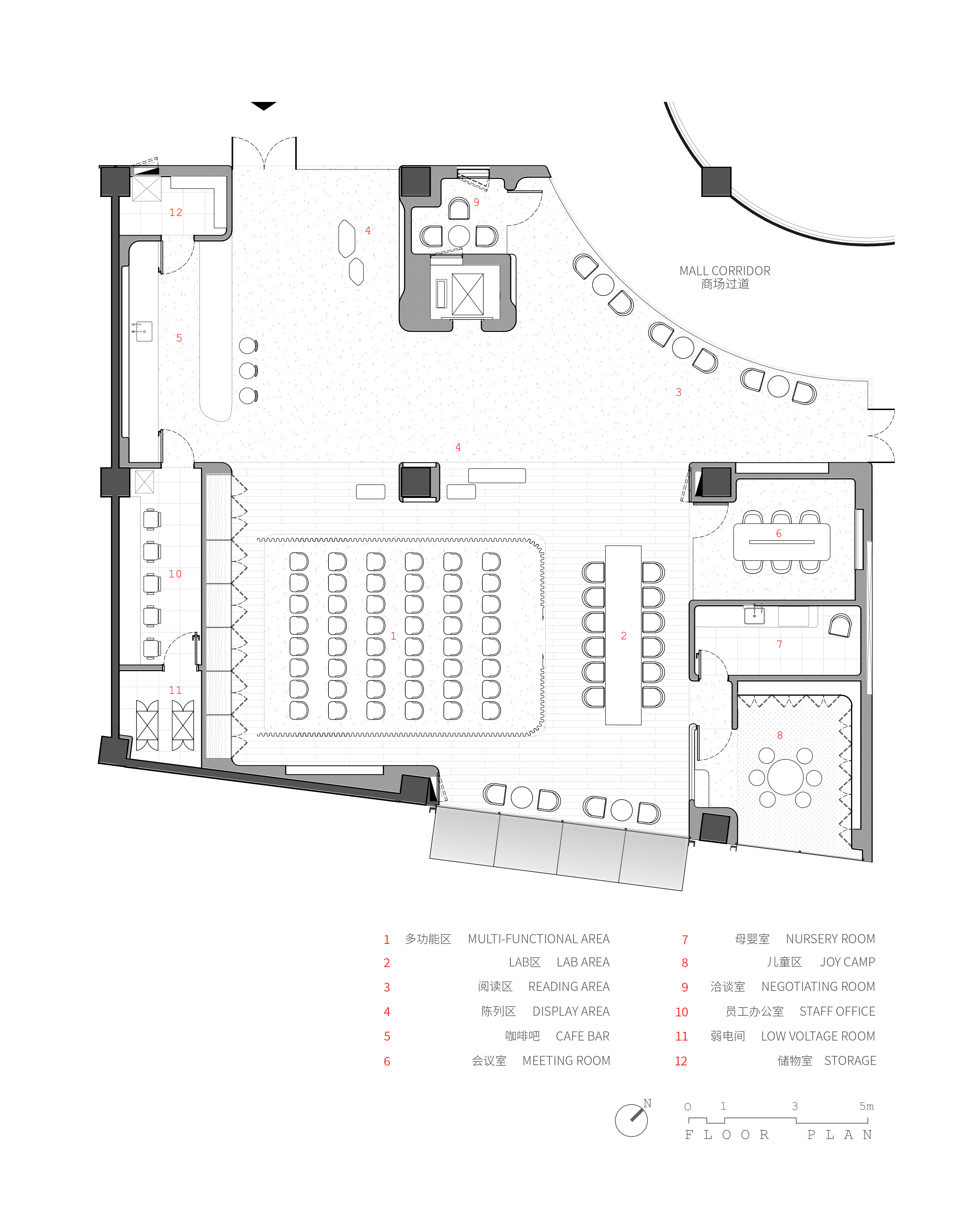 On the user floor, the wavy ceiling arches are modular and originally proposed to be glass fibre reinforced gypsum sections manufactured in factory and assembled on site. While light coves on the sides wash each arch softly for ambience, tracks are integrated between arches where spot lights could be installed freely, making a flexible space for different kinds of display.