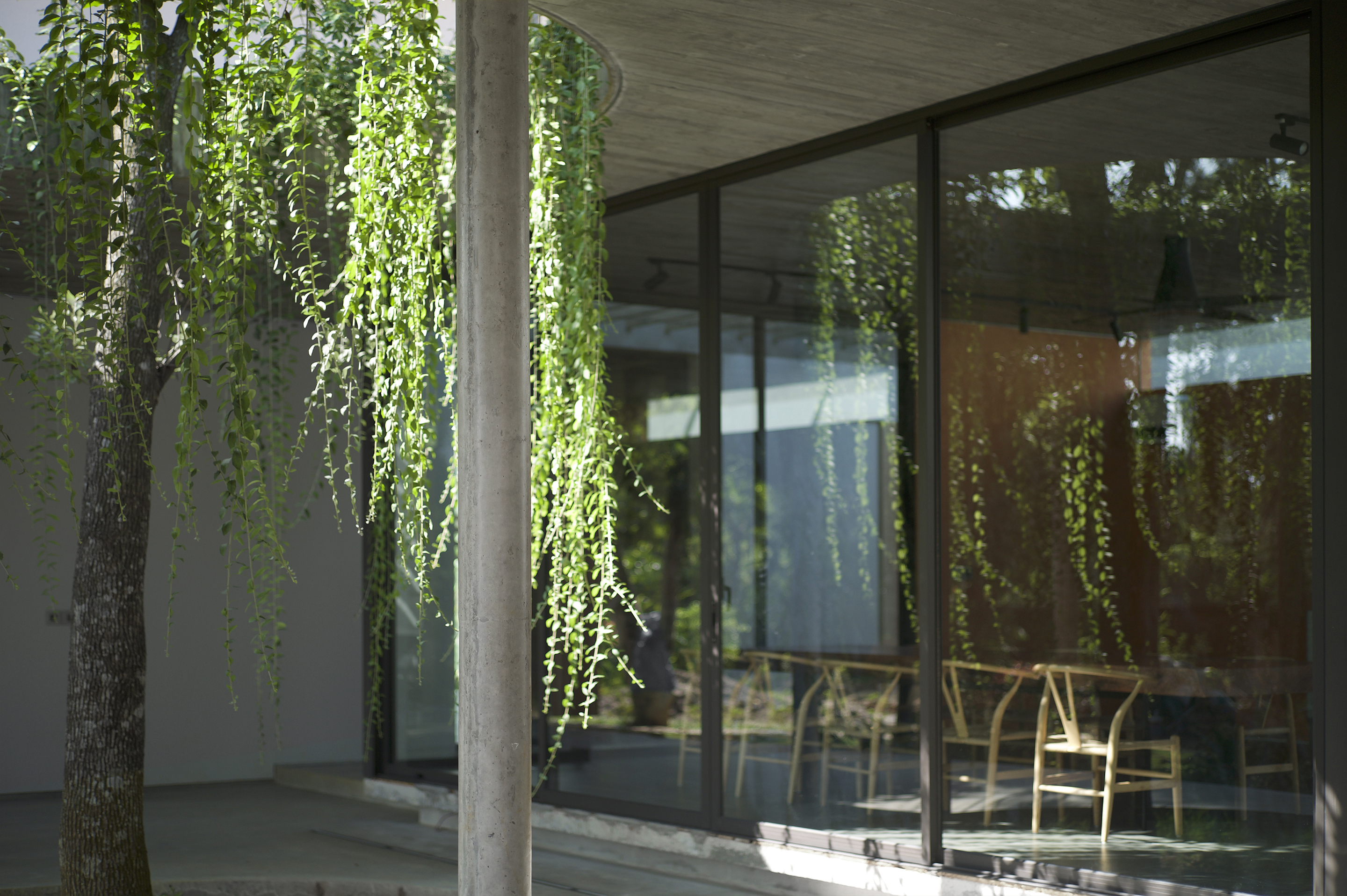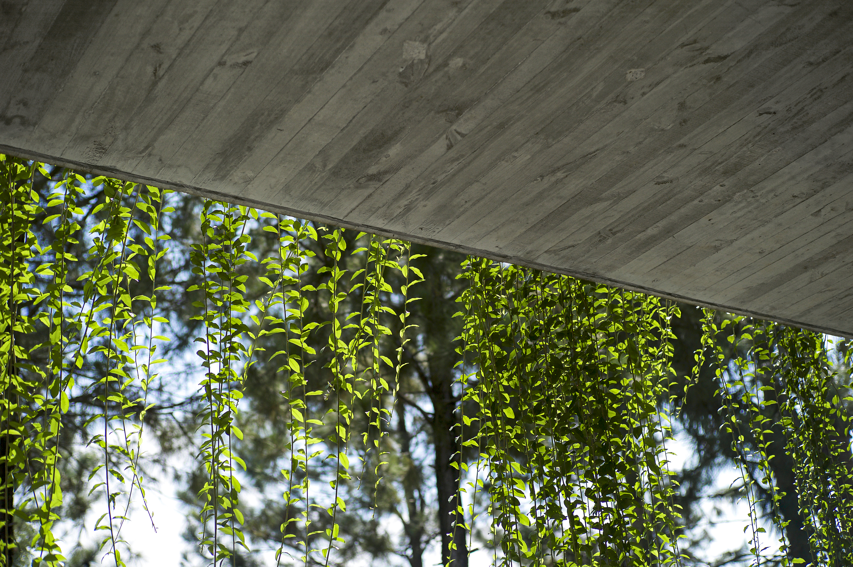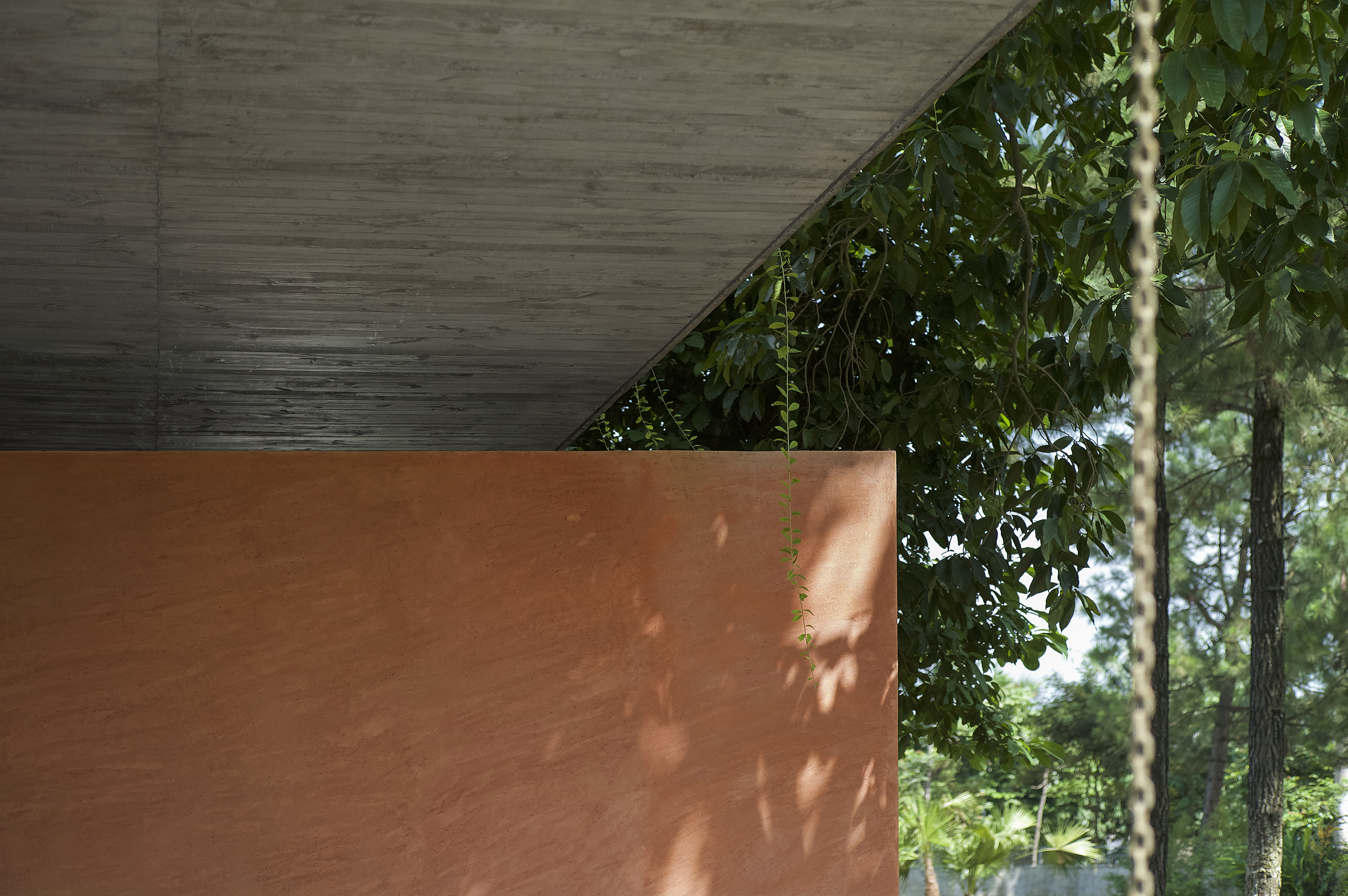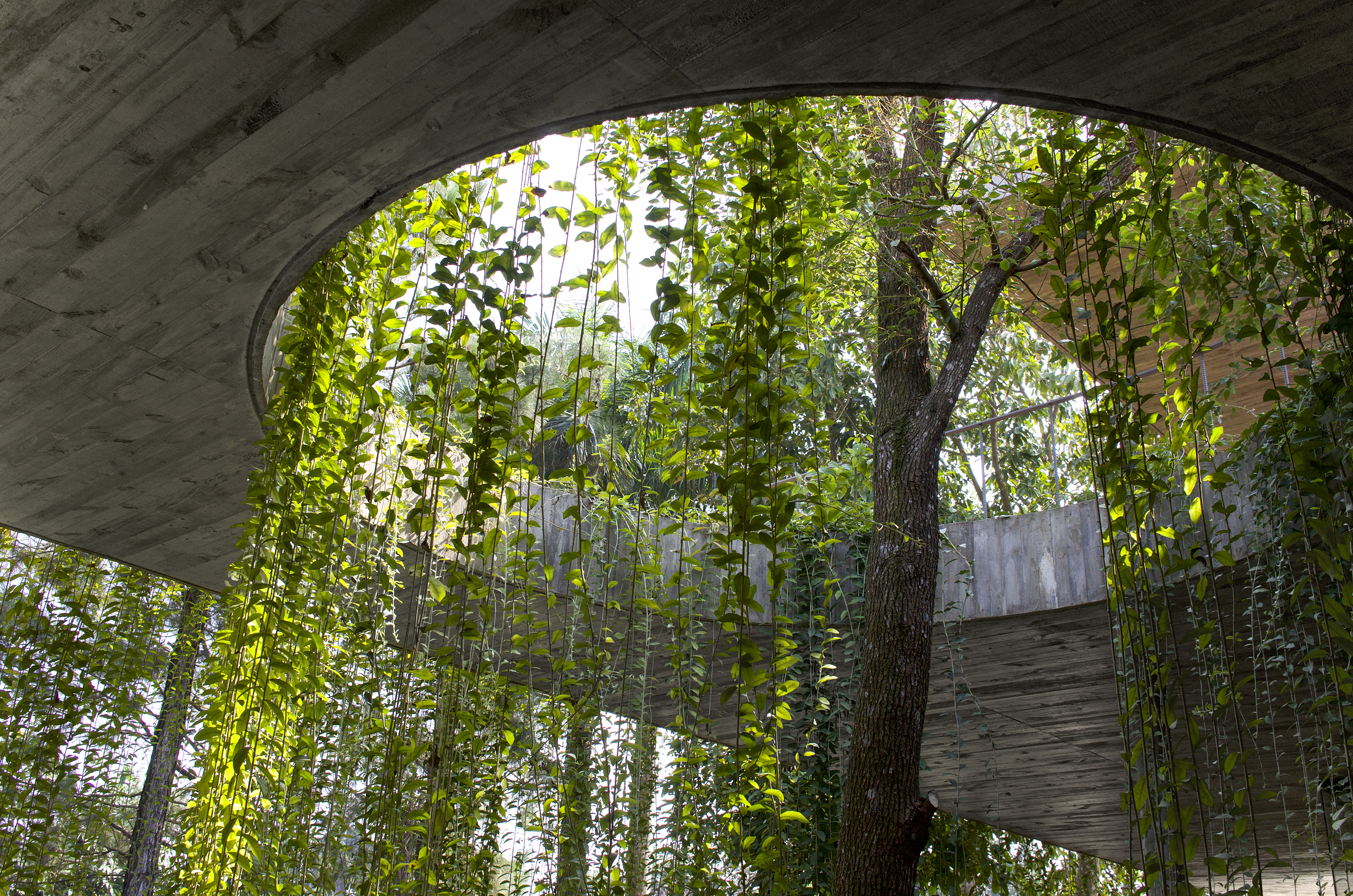 The construction, because of its sophisticated roof structure that goes beyond the structural system which gives the building a gravity redefining look. The thin and light canopy running along the length of the building creates a wide, open porch filled with green nature, and under the 30 meters long canopy there is no sign of any structural column.
