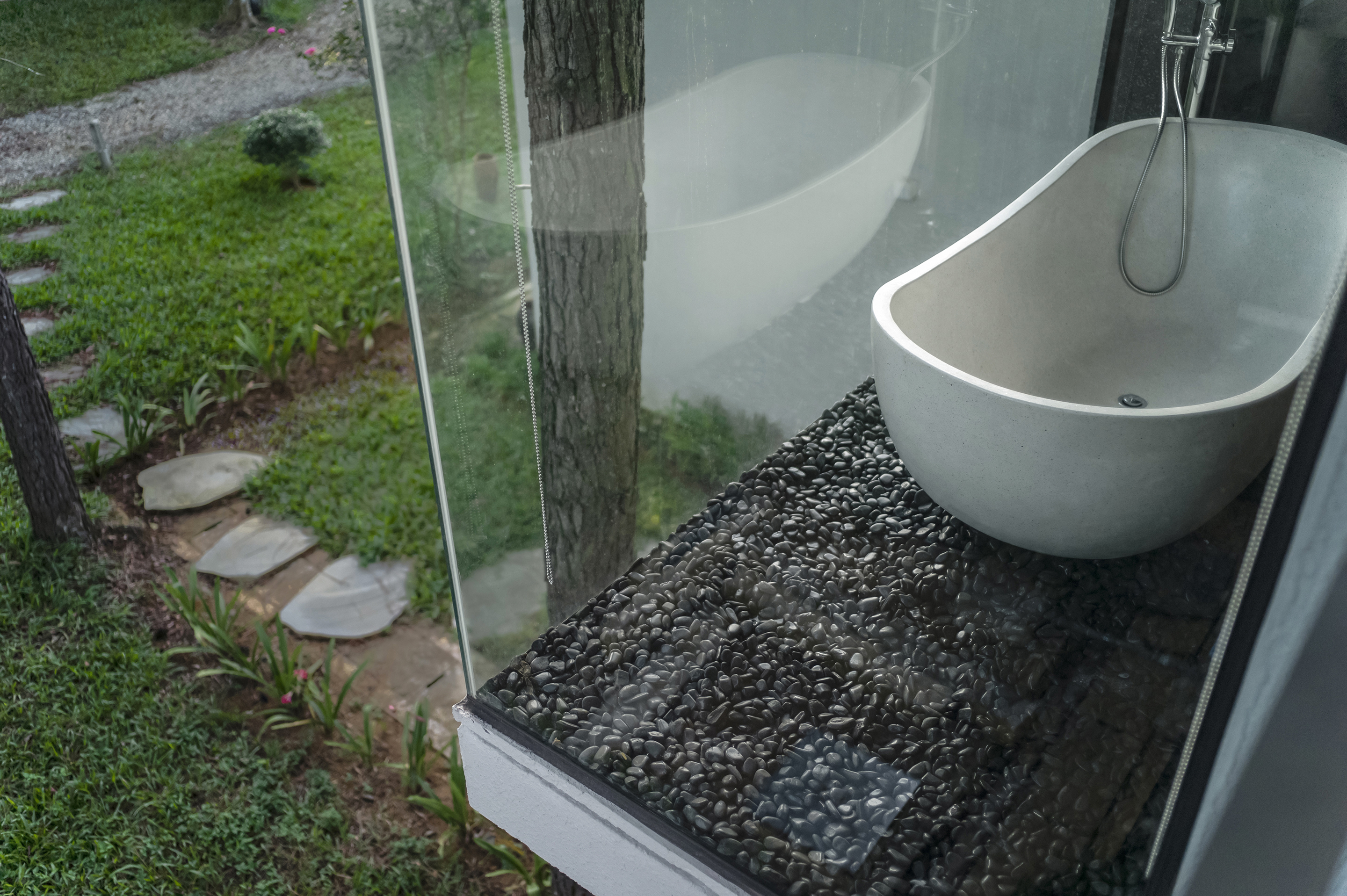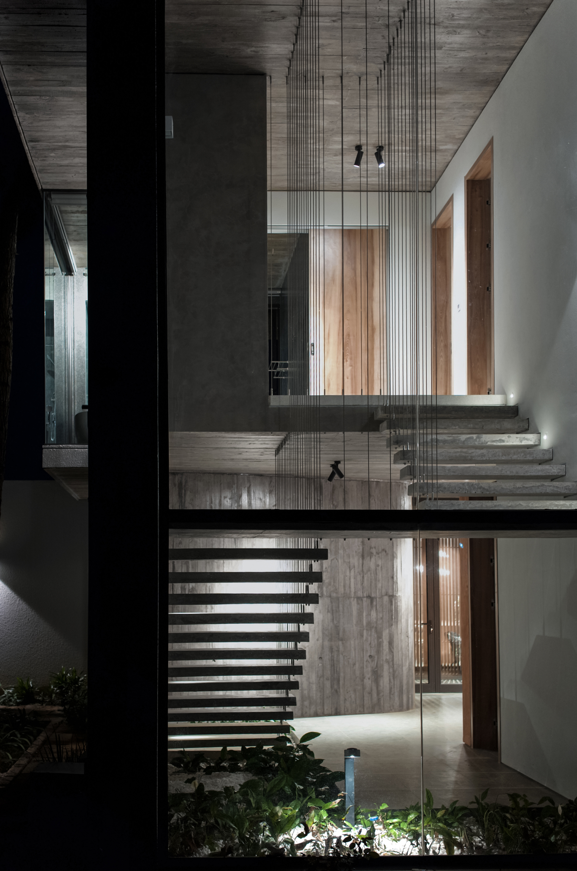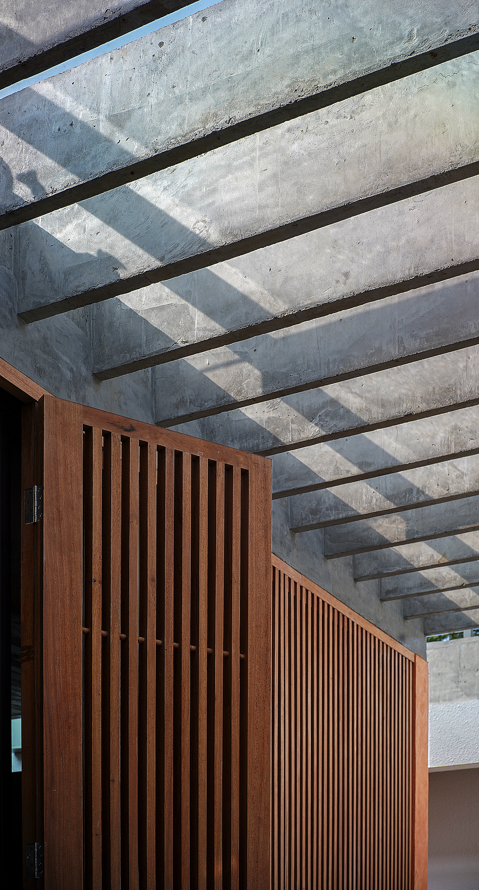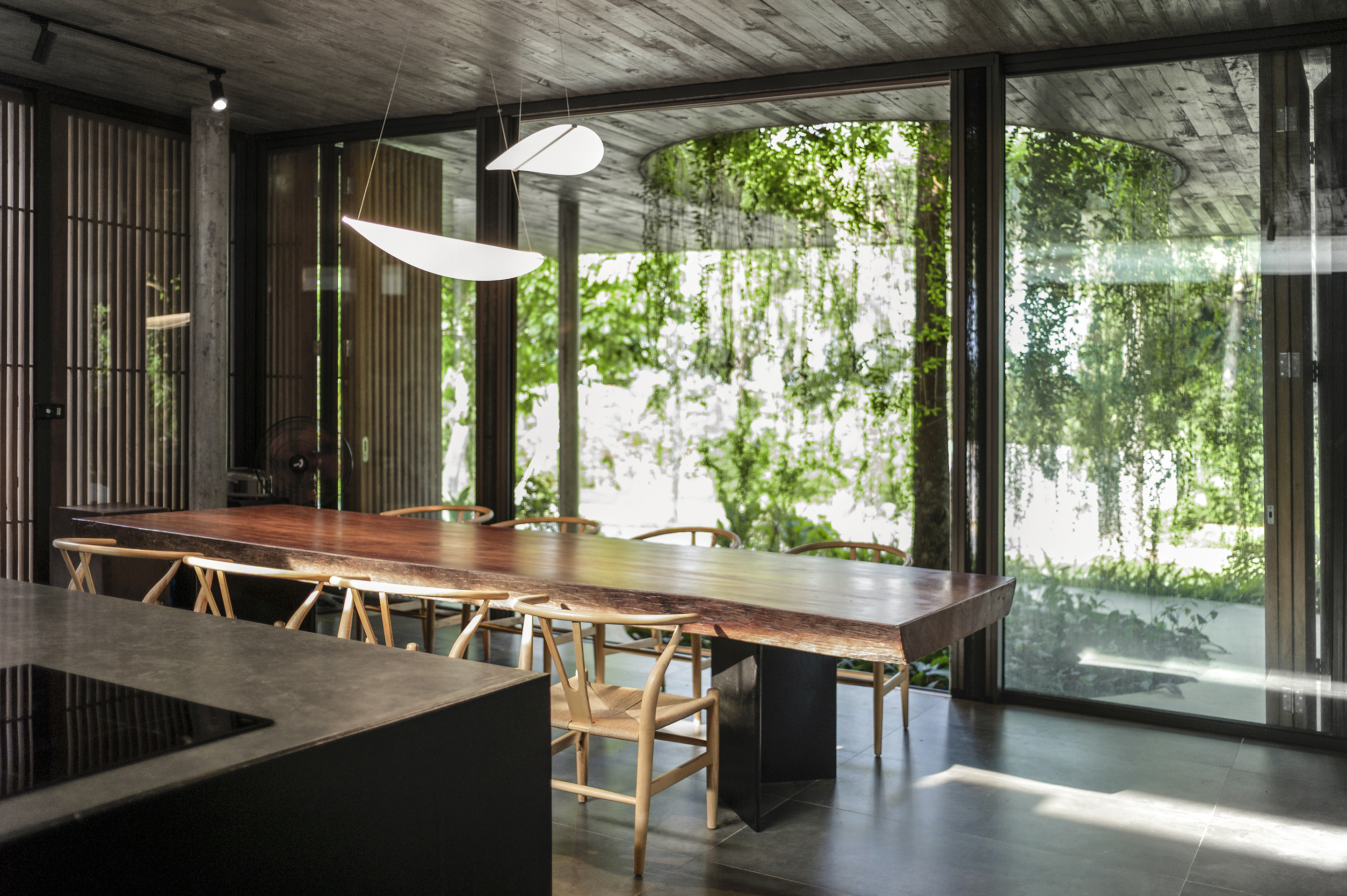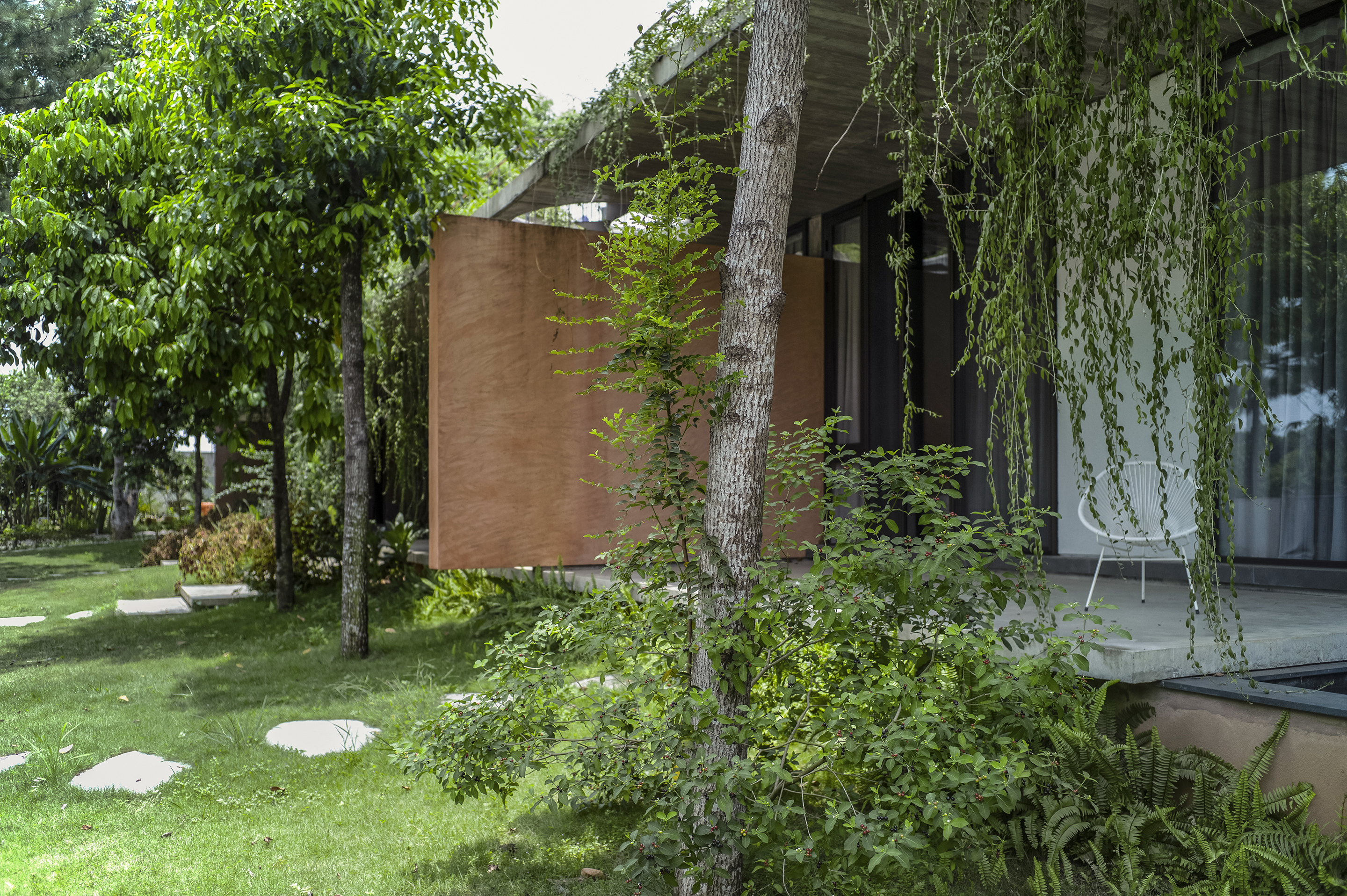 We keep asking ourselves about how to design a massive structure but somehow it still blends in well with its surroundings. From afar, the large structure can only be distinguished by the outline of the roofs on the two levels. The building blocks hide under the roofs and create voids that connect the internal spaces with its inhabitants and the nature surrounding them. The bare concrete surface and the wood pattern aims to create a rustic and natural feeling but still ensure the elegant and comfortable of the modern lifestyle. This construction is also special because of its sophisticated roof structure that goes beyond the structural system which gives the building a gravity redefining look. In front of the kitchen blocks is a wide, open porch, the residents can sit on the porch or in the kitchen and admire the blue sky under the trees or feel the rain falling outside on a rainy day.