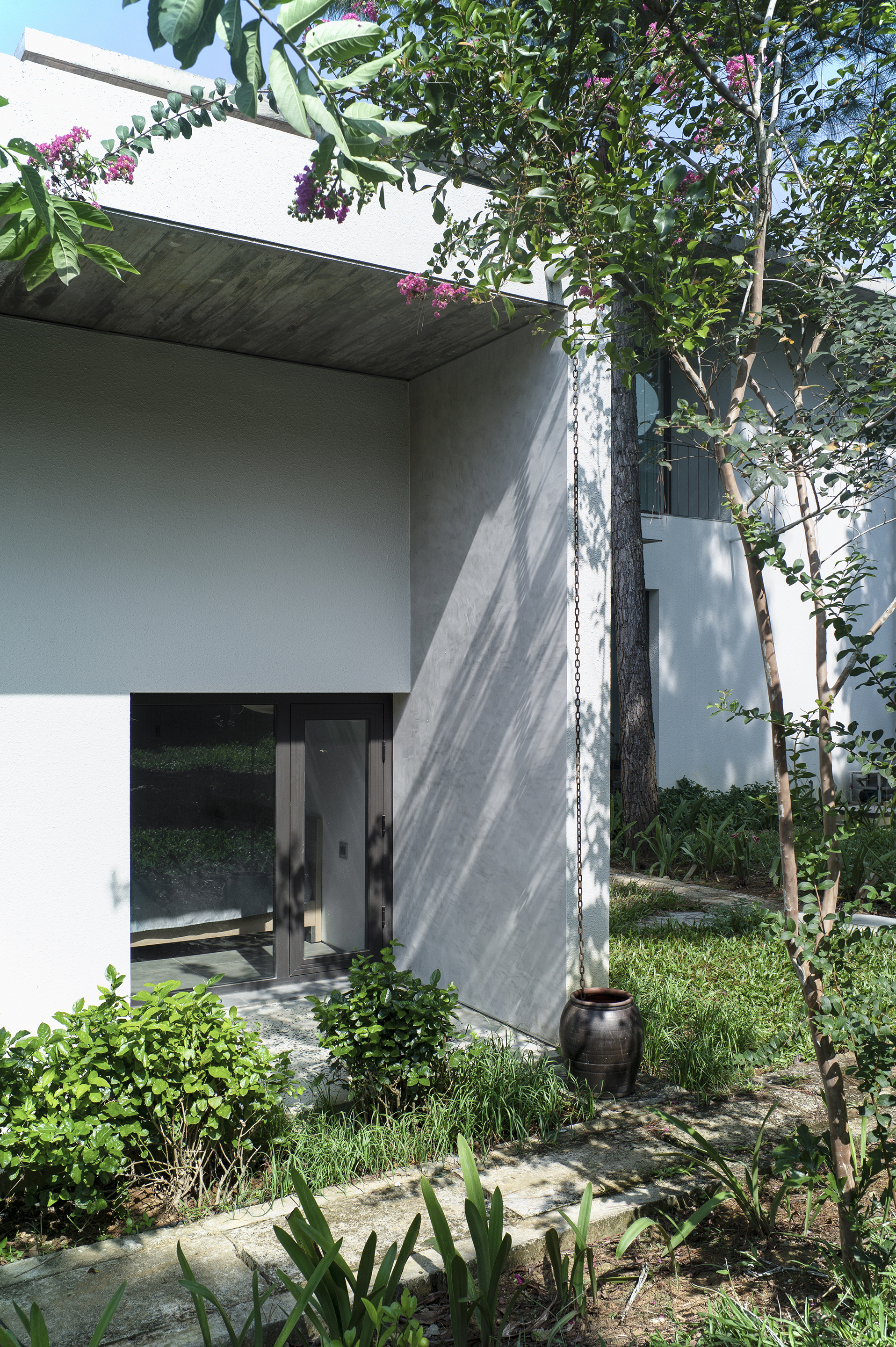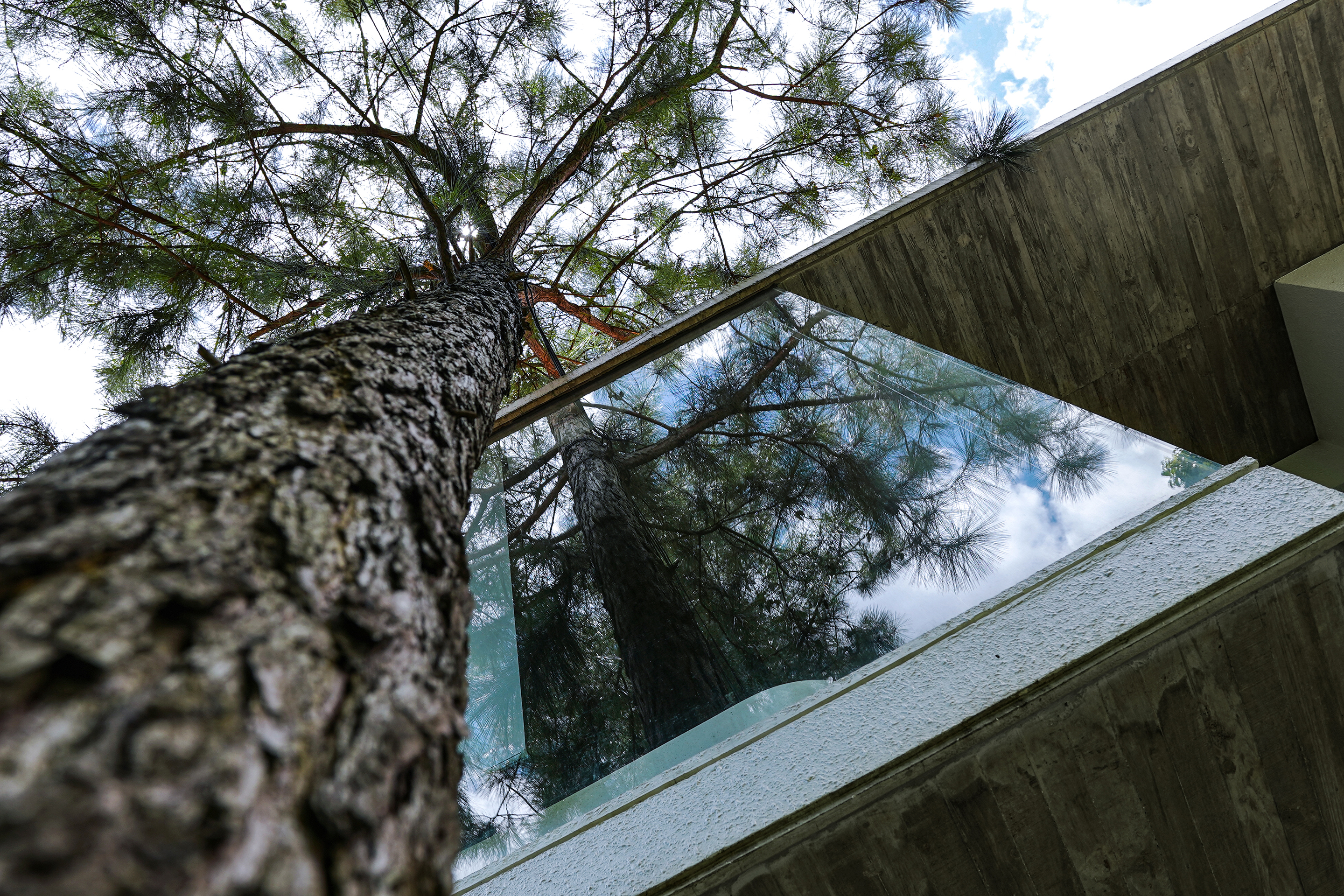 During the construction of this house, most of the pre-existed pine tree forest remained untouched. While the building was designed in a way that its structure spread out in different directions horizontally, it still left room for the pine trees to thrive and underneath the existing pine forest, this house is surrounded by its own gardens.