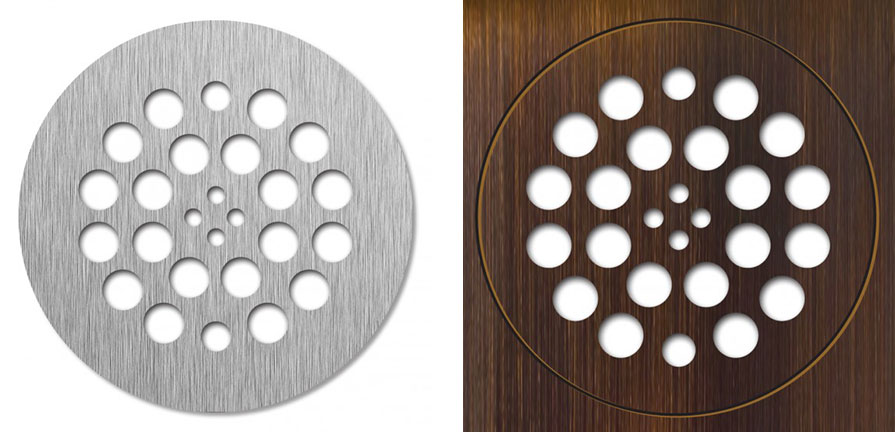 Sporting a fun circle pattern, these drain grates come in a 4.25-inch-diameter round or 4.25-inch-wide and -long square format. The round version can also be paired with a square trim for a different aesthetic. The covers are offered in brushed nickel, polished chrome, or oil-rubbed bronze finish.