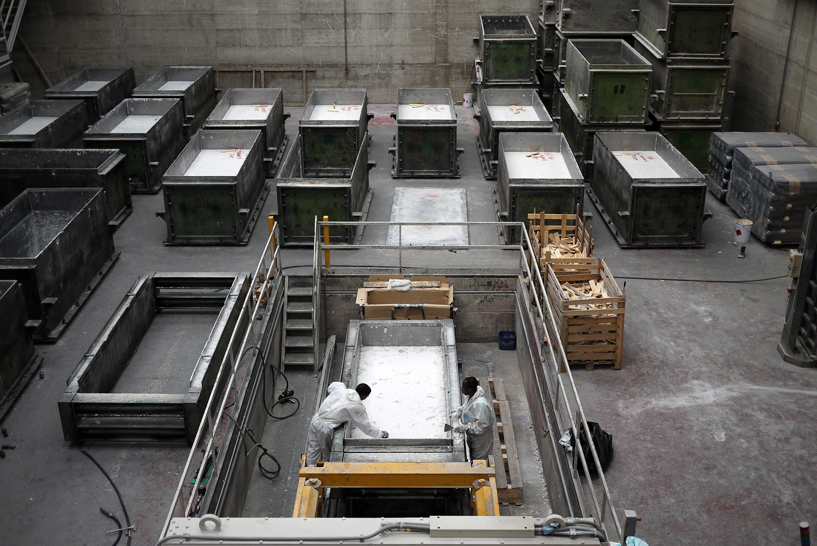 Dzekciorius started Dzek in 2013 as an “architectural materials company,” and it works as a running series of collaborations with designers like Lamb. “Our focus shifts depending on our collaborators,” Dzekciorius said, and the company is currently working to produce a product out of volcanic ash with the Italian duo Formafantasma. Dzek has taken the Marmoreal tile and turned it into bathroom furniture, like a tub and sink, and general furniture, like a desk and lighting fixture.