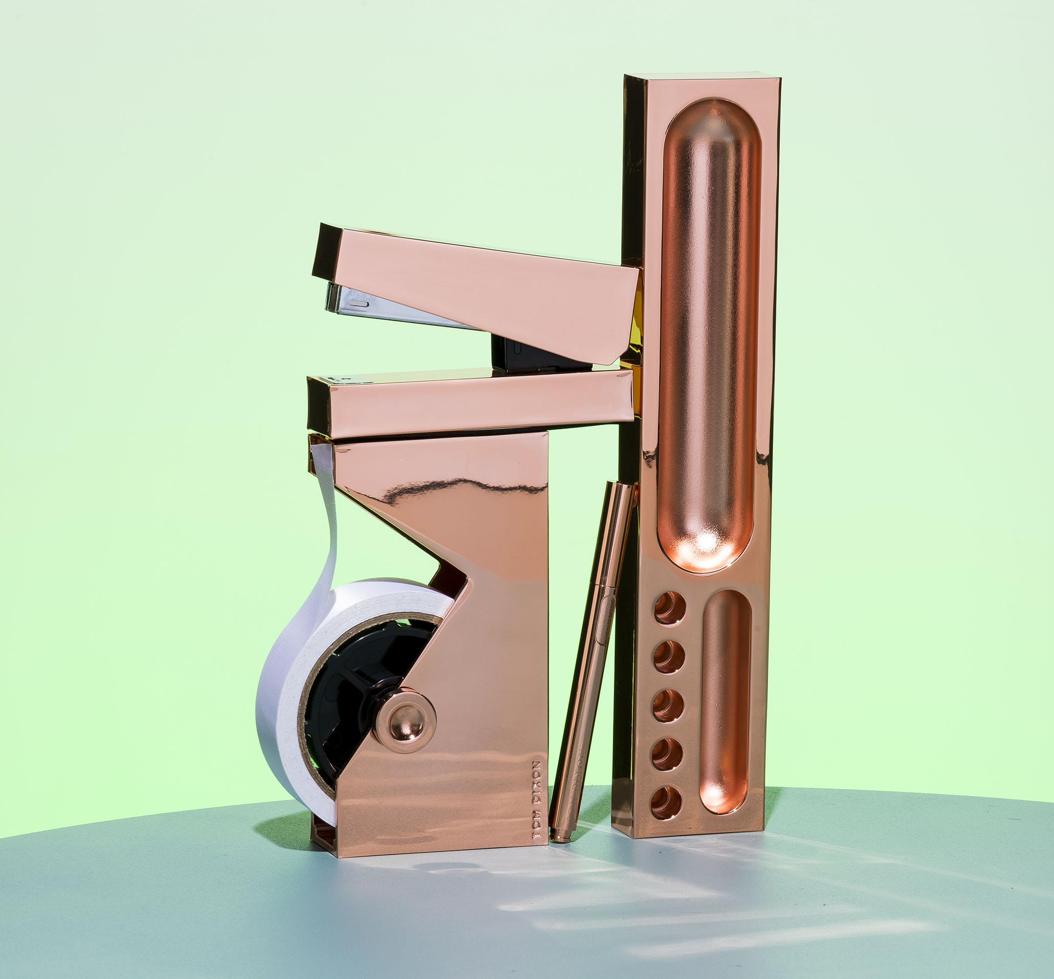 A super elegant line of desk accessories, Cube comprises a tablet stand, mechanical pencil, pen, organization tray, stapler and tape dispenser, all with a shiny copper finish.