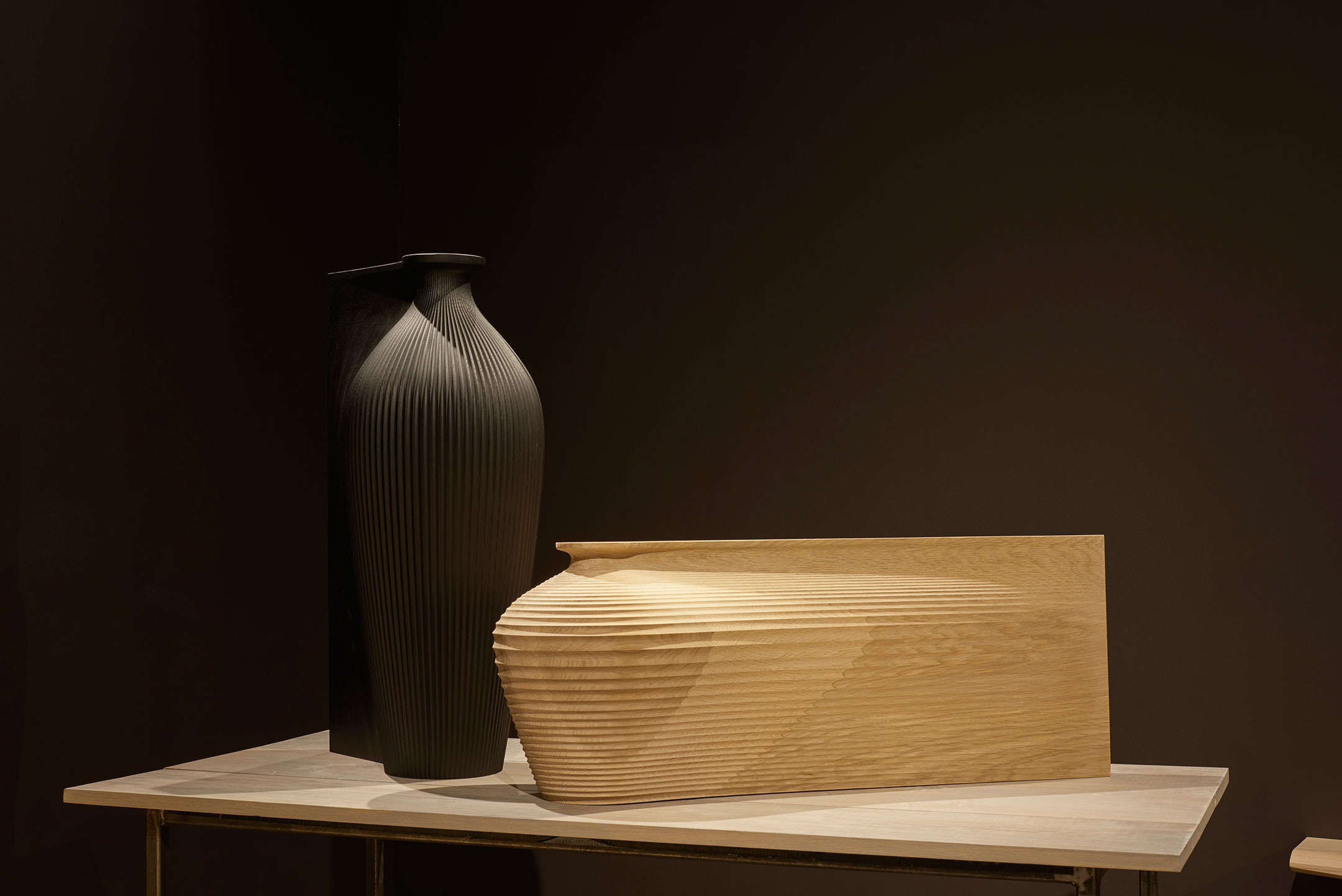 For VES-EL, shown by London’s Sarah Myerscough Gallery, Gareth Neal was granted access to Zaha Hadid’s computer modeling platforms to digitally imitate traditional hand-thrown pottery. The American Hardwood Export Council and Benchmark Furniture initiated the collaboration between designer and architect, and the resulting carved oak vessels were first exhibited at the Victoria and Albert Museum in September 2014.
