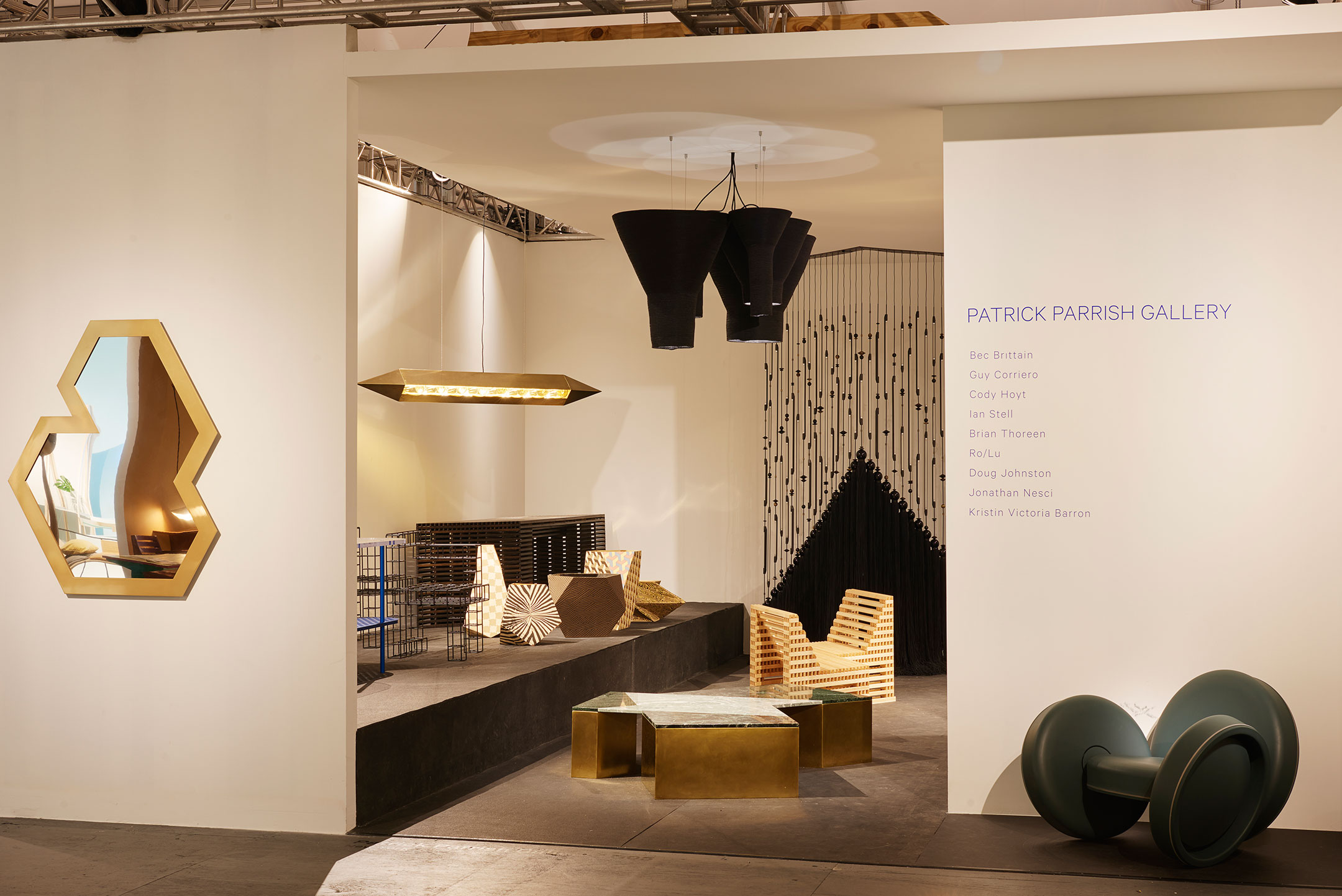 Brooklyn lighting and product designer Bec Brittain debuted Mercury with Patrick Parrish Gallery (shown here at the far end of the gallery’s Design Miami/ booth). Mercury comprises 35 strands of LED tubes, oversized stone beads, and massive suede tassels that, suspended in an L shape, can provide both spatial organization and illumination to an open plan.