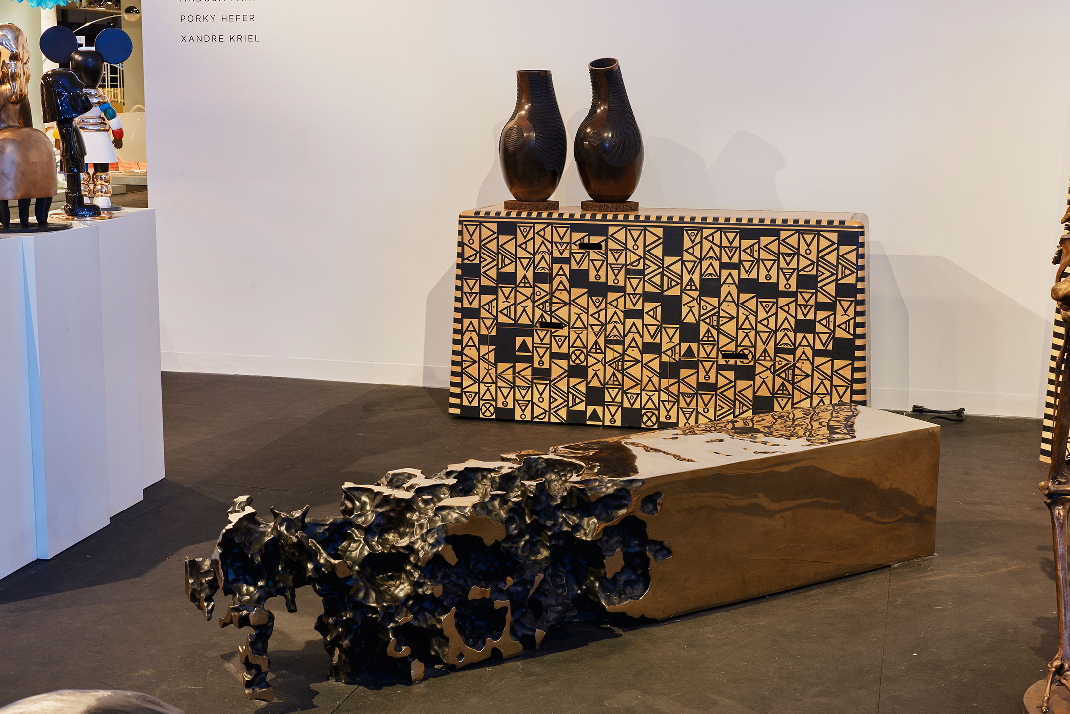 The Design Miami/ booth of Beijing- and Los Angeles-based Gallery ALL had a strong architectural appeal, overall, with highlights that included the Off-Railing Series by ArandaLasch and Naihan Li’s cabinetry disguised as iconic buildings. The Metsidian table by Janne Kyttanen, shown here in the foreground, ponders the potential of 3D printing in the design industries, as the stunning form uses both that technique and explosion welding to fuse obsidian to gridded copper.