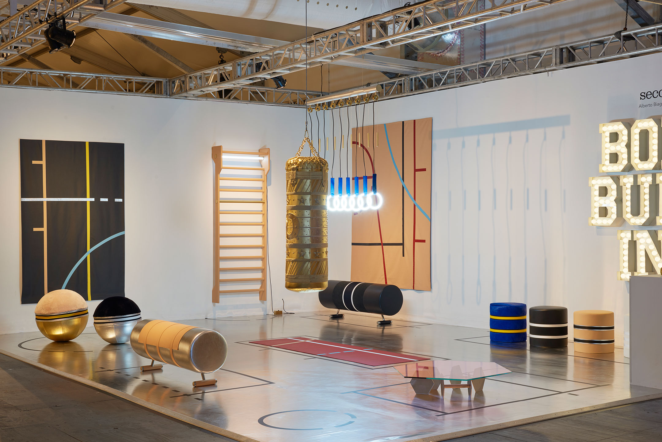 Rome’s Secondome gallery turned its entire Design Miami/ booth over to Body Building by Milan-based duo Alberto Biagetti and Laura Baldassari. The furniture does not so much capitalize on the nascent pommel horse-as-clever-seating trend as it tries to generally domesticate athletics. In so doing, these rings and dumbbells and playing fields reappraise the gym’s place in a fitness-obsessed urban ecosystem.