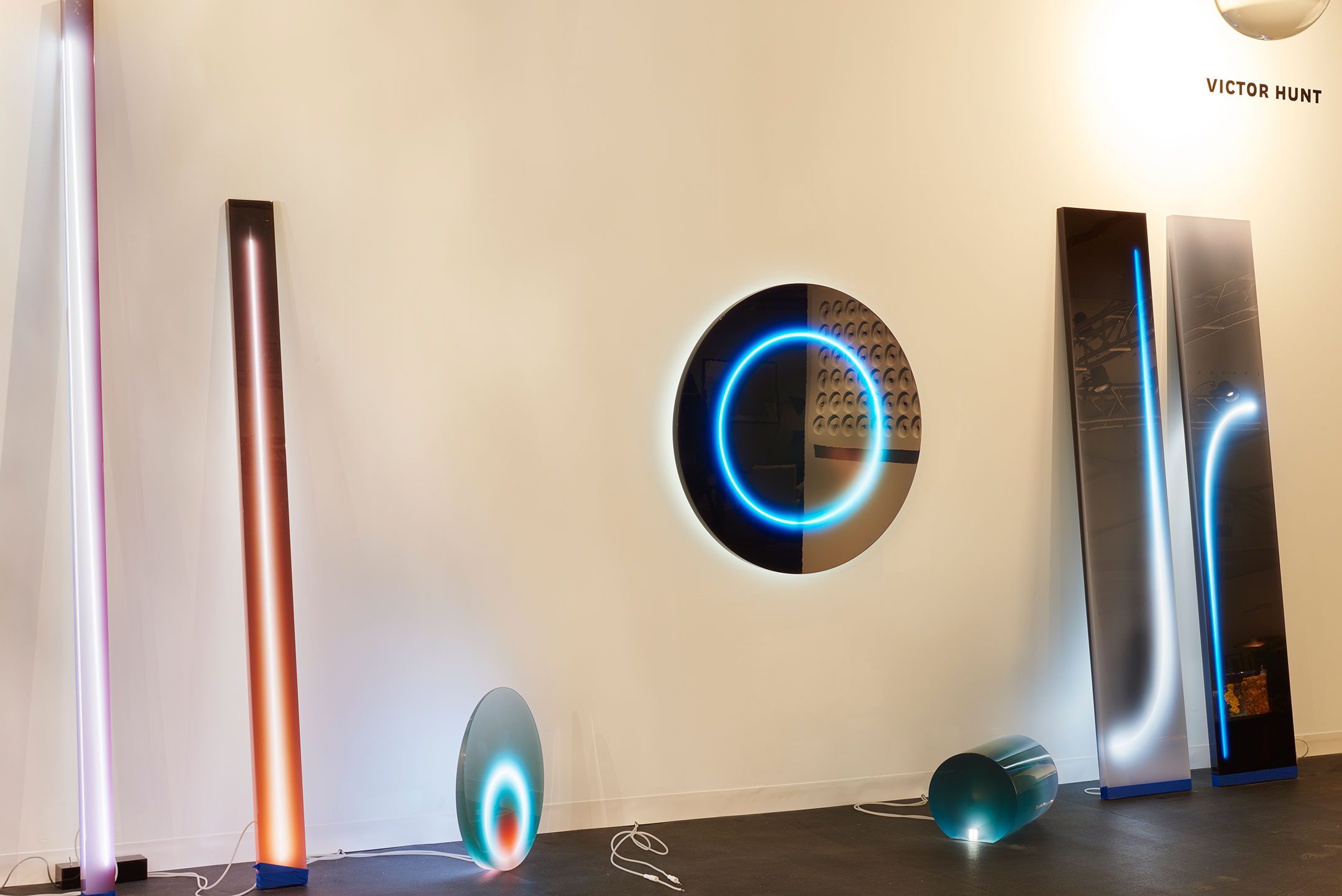 Dawn Lights, created by Rotterdam-based Sabine Marcelis and presented by Victor Hunt Designart Dealer of Brussels, embody the slivers of colored light that appear momentarily at dawn and dusk. The luminaires, which feature white neon tubes embedded in cast resin, are a continuation of Marcelis’s Voie Light Series project.