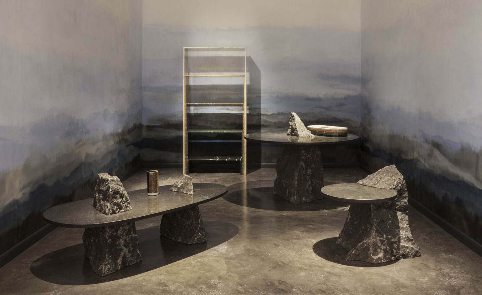 New York- and San Francisco-based The Future Perfect presented Fragments at Design Miami/ as part of the fair’s Design Curio initiative. Featuring compositions of rough-hewn and honed marble by Dutch designer Lex Pott surrounded in a landscape scene hand-painted with pigment derived from the same material by Calico Wallpaper, the installation is, at first blush, a consideration of the natural and manmade. Second and third glances revealed a commentary on the parametric design trend — plus a lesson in decorating with avant-garde collectibles.