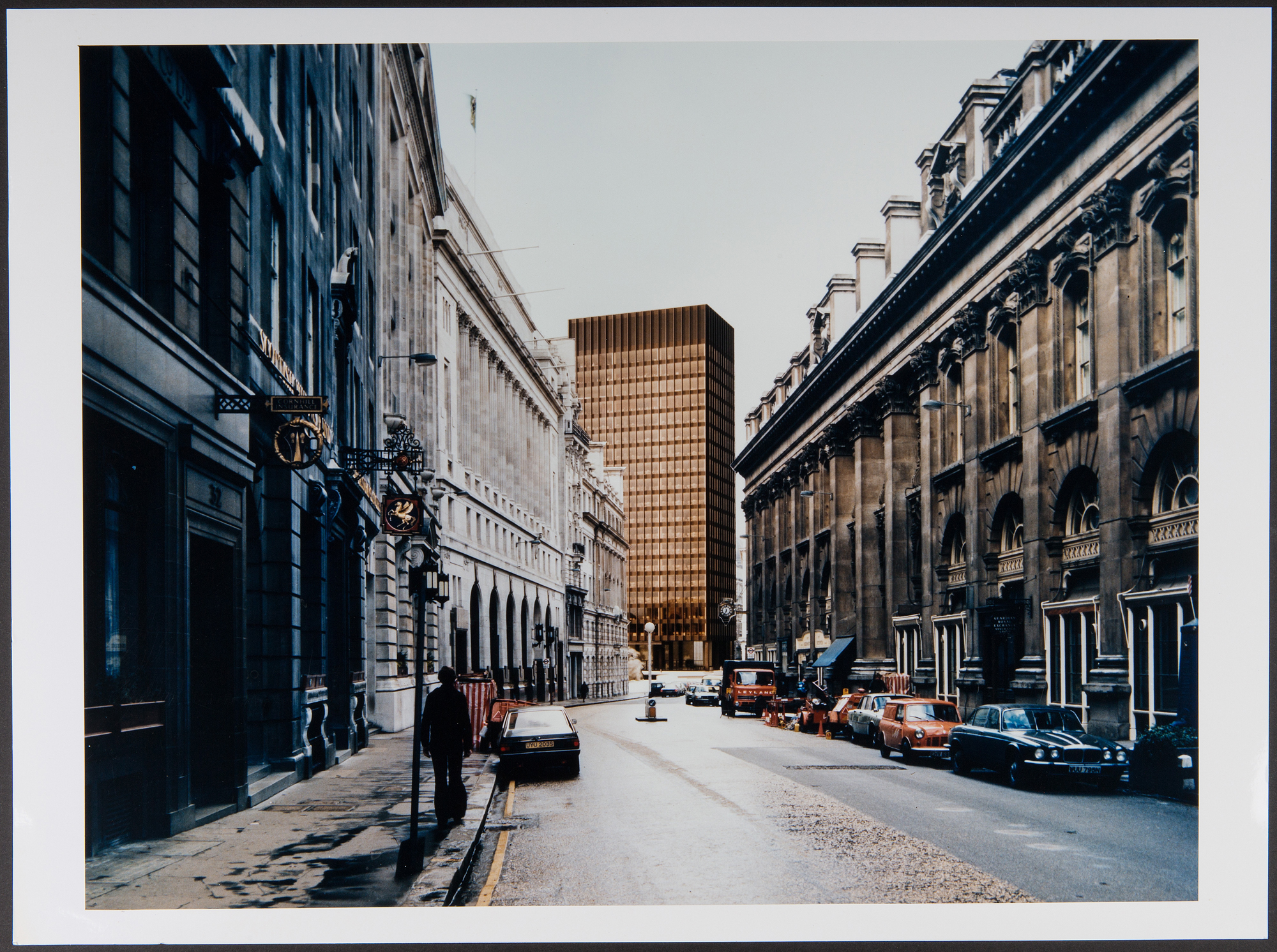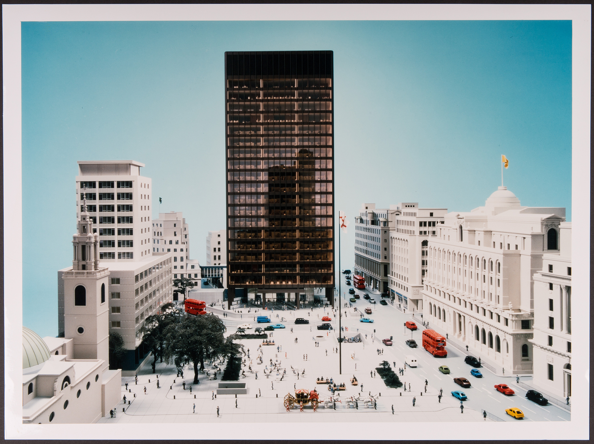In the wake of British architect James Stirling’s beloved Postmodernist landmark No 1 Poultry receiving a Grade II historic listing in late 2016, a prior narrative of the site’s architectural past begins to emerge. Famed modernist Ludwig Mies van der Rohe had developed his last and only U.K.-based project for the London site proposed originally as Mansion House Square. Commissioned by private developer Lord Peter Palumbo in the early 1960s, the unprecedented plan to erect a modernist glass tower in one of London’s municipal centers was eventually denigrated and denied planning permission by the early ’80s. Following the demise of the project, Palumbo withheld all physical records of the skyscraper, shrouding the last works of one of architecture’s greatest figures in obscurity.