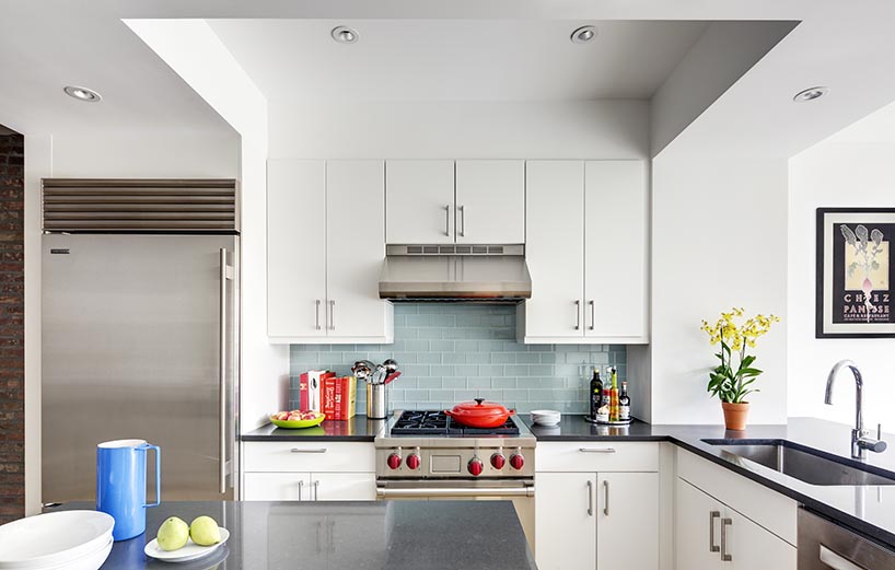 This project is a renovation and extension to a 12′ wide rowhouse in Brooklyn, New York. BFDO completely gutted the existing four story brick building and added a two story extension. Updates include opening up the parlor floor and creating a new wood and steel switchback stair along the exposed brick wall in the center of the structure.