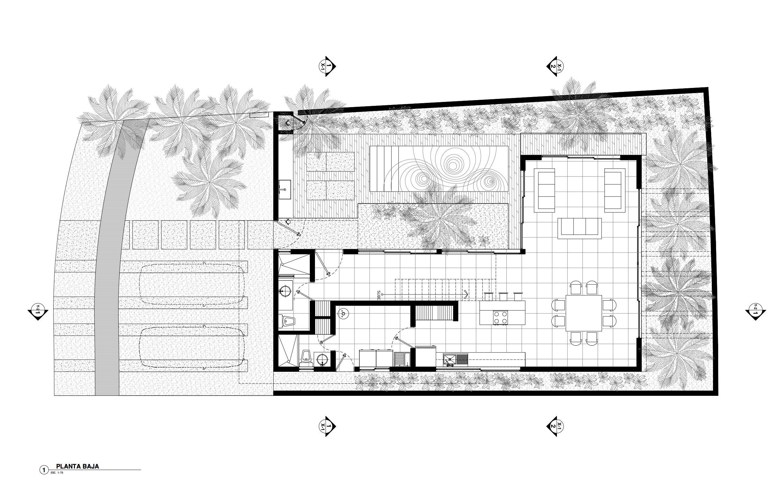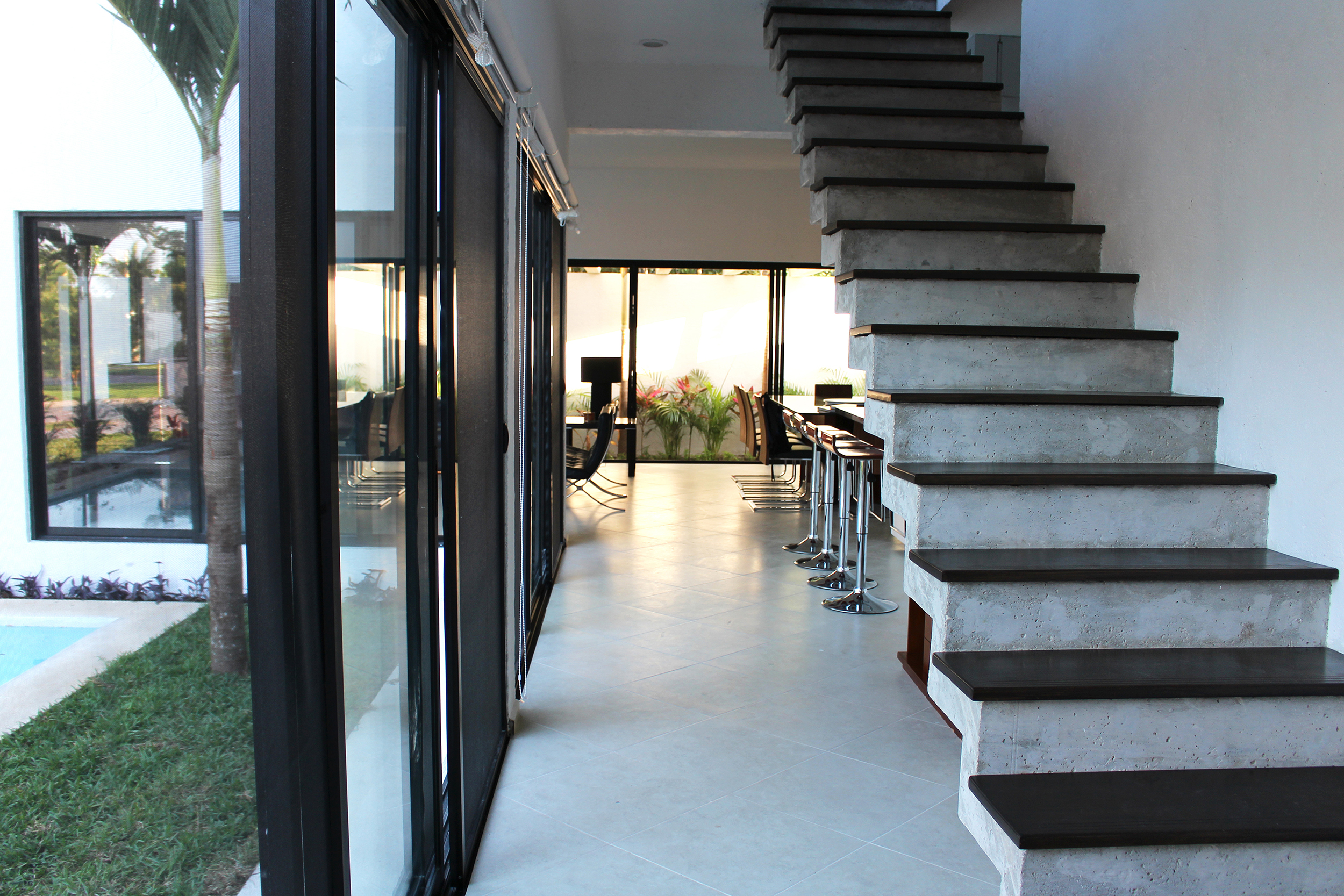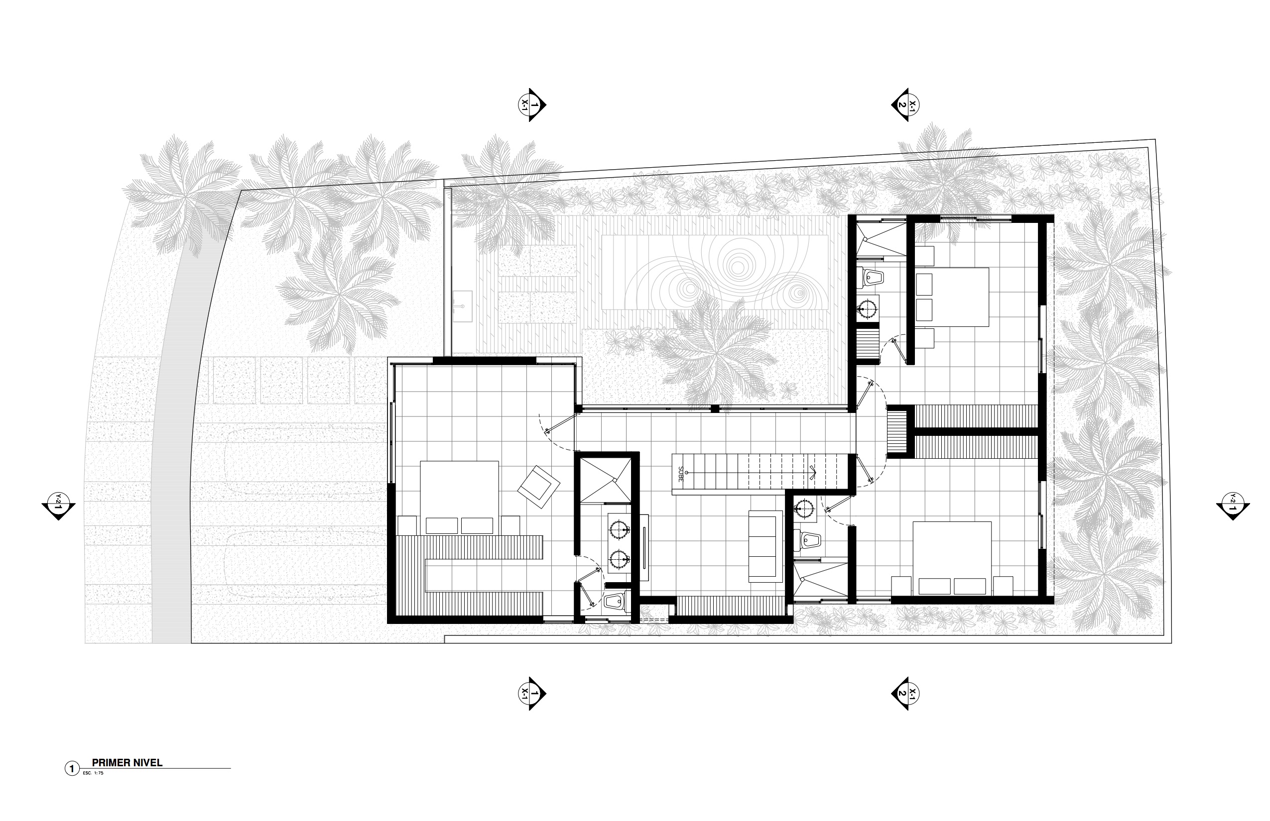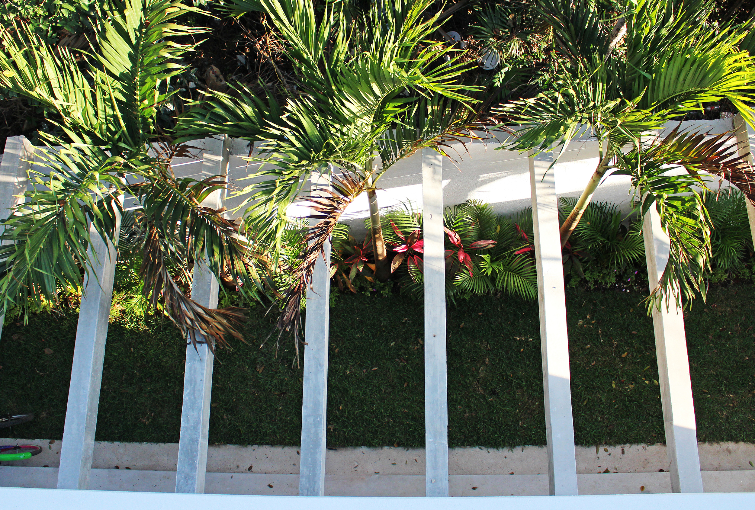 The backyard garden is covered with concrete beams that create shadows and let some palms grow through them, helping to screen the view of the bedrooms on the first floor.