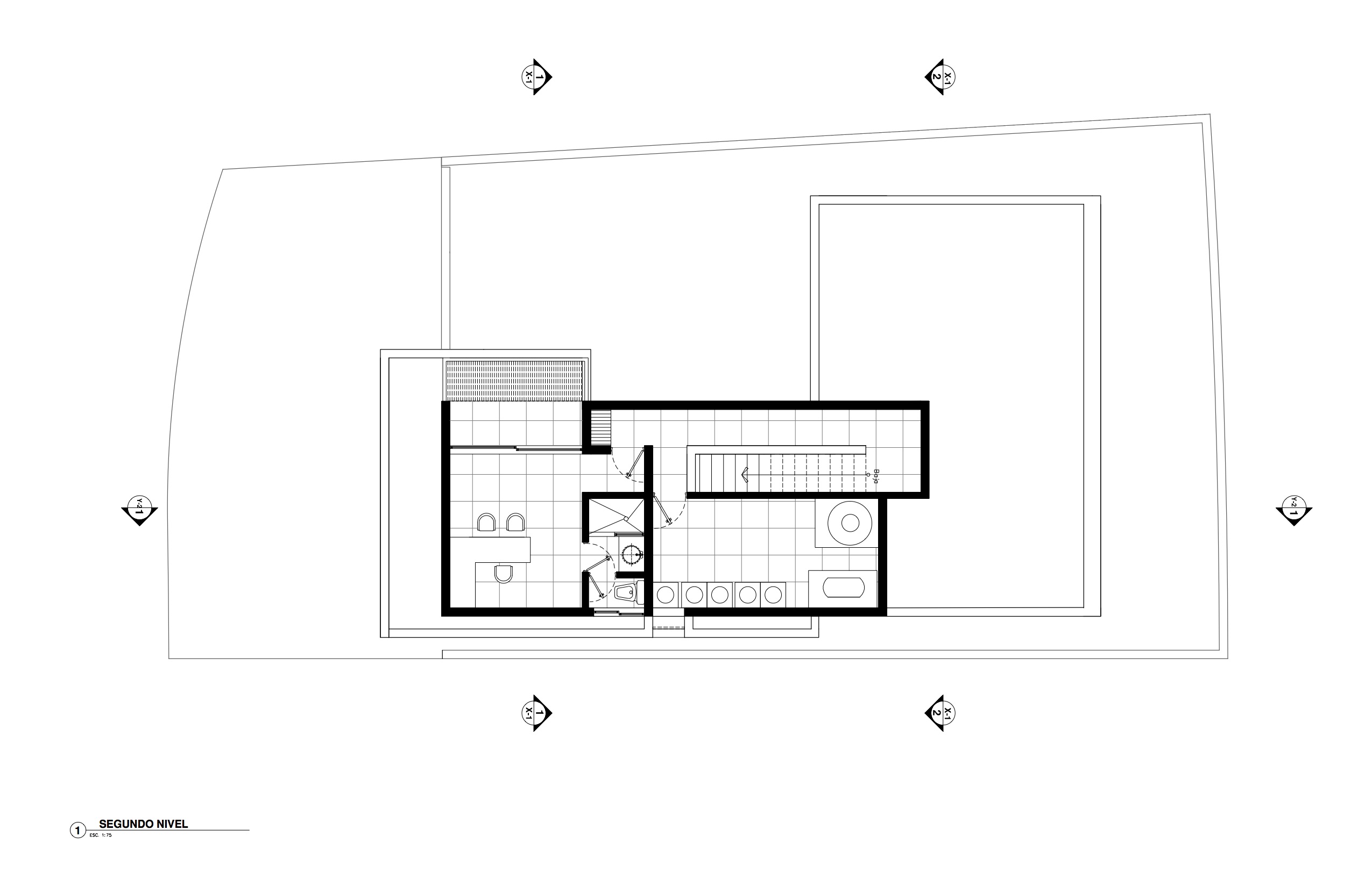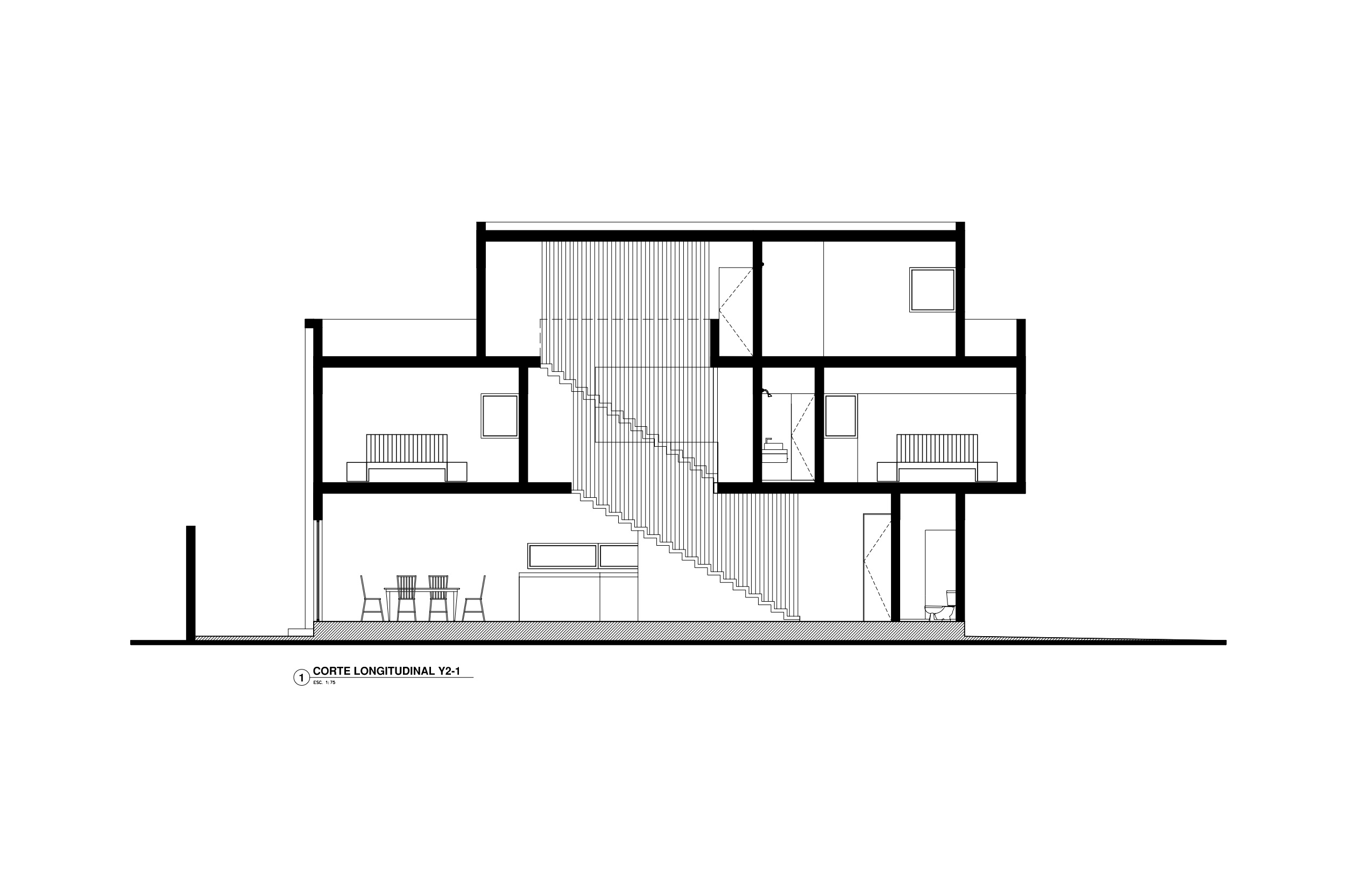 A black prefabricated stone wall in the main façade vertically crosses the master bedroom, which is a white cube contrasting two different textures, colors, and areas.