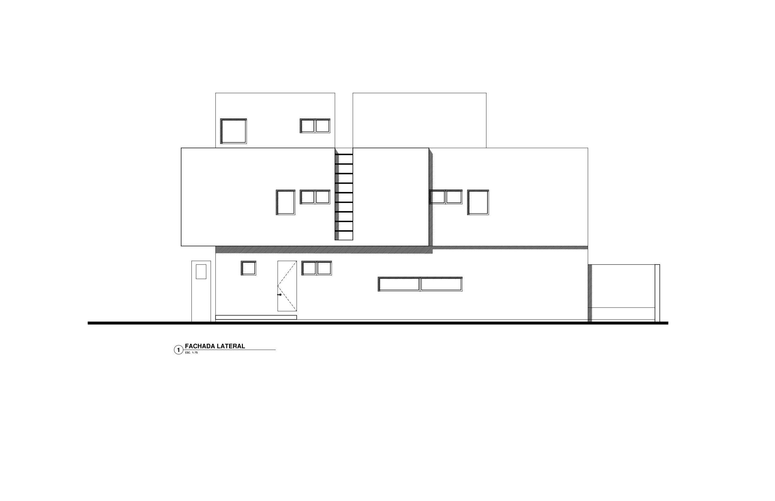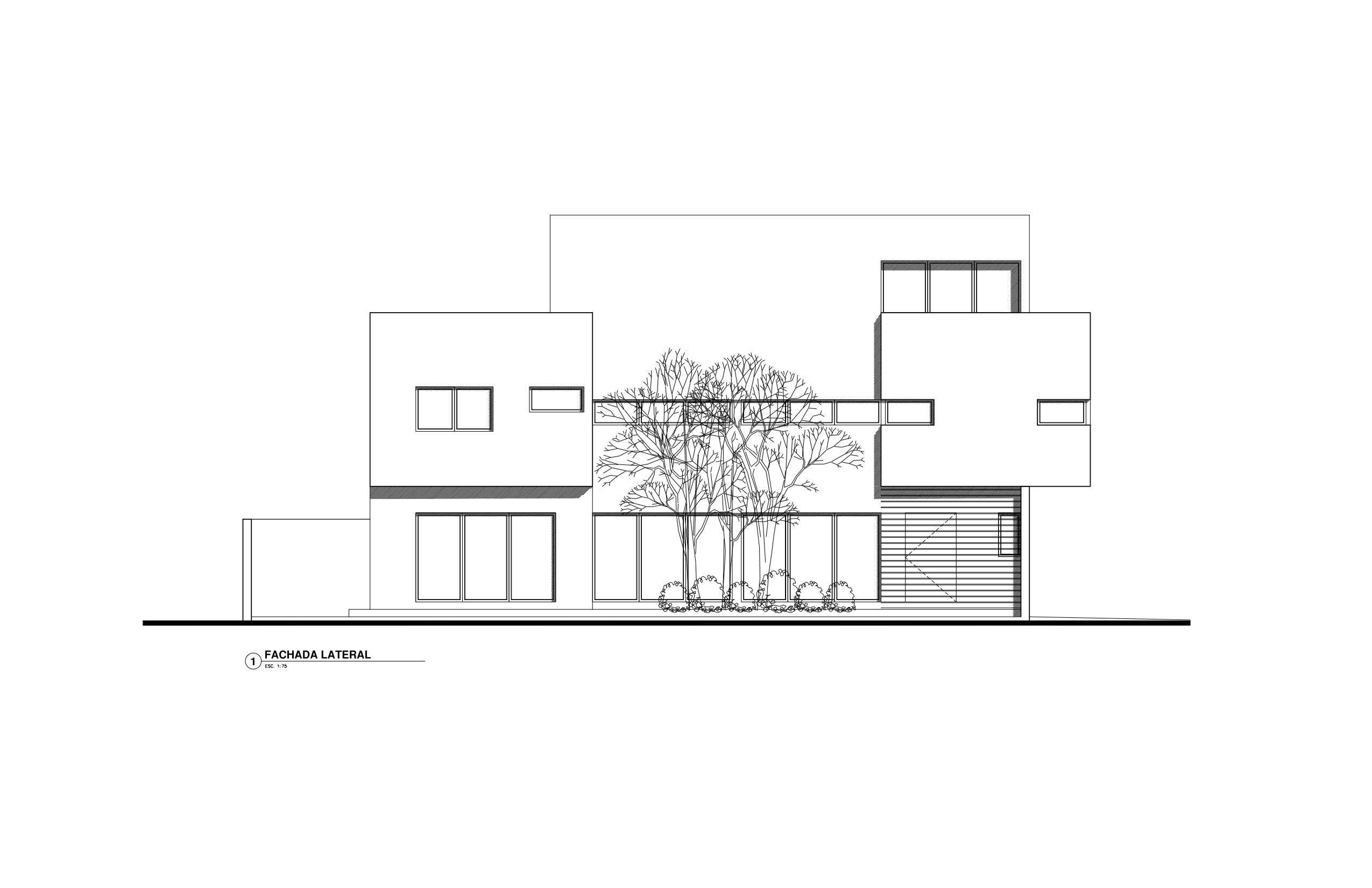 The wooden main entrance door treatment is annexed to the second main entrance, where the Brazilian Cumaru wood helps to exalt and rank the access, giving the house a warm feeling between the cold black stone and concrete walls.