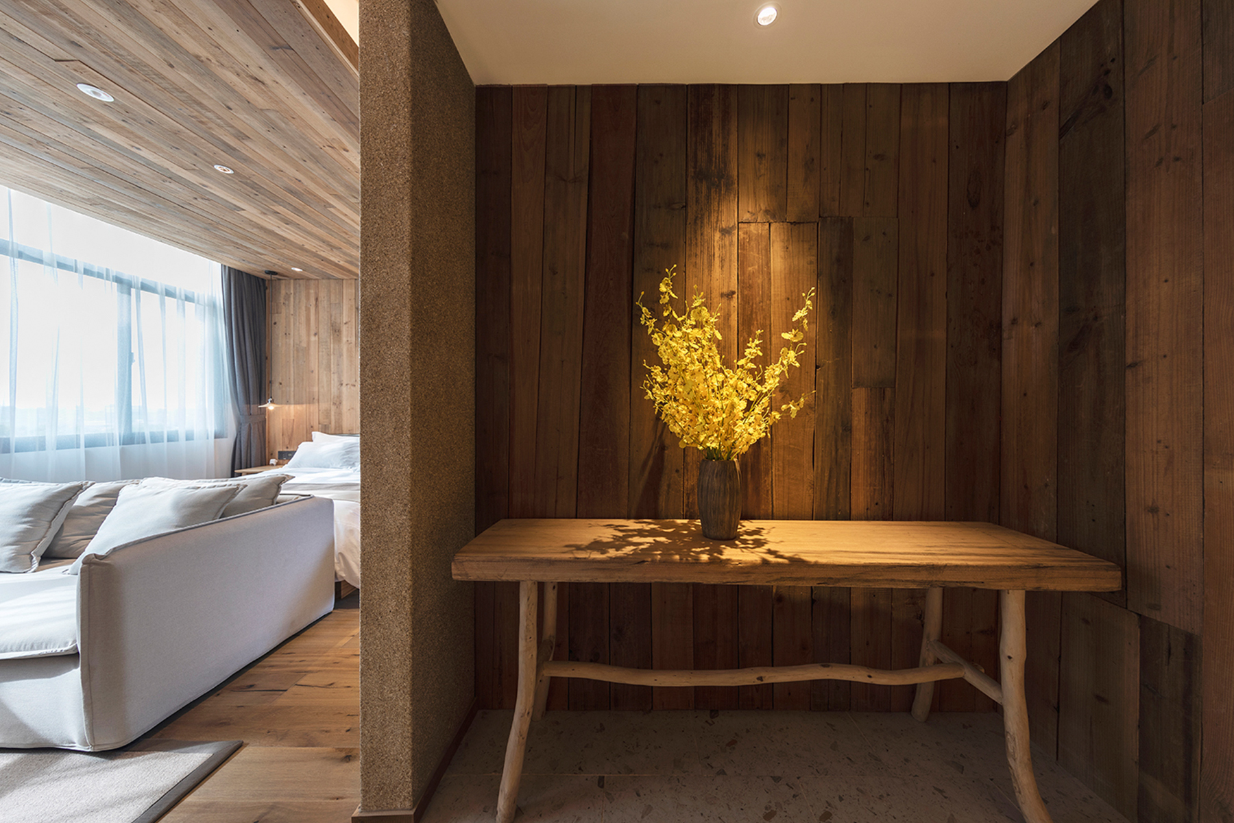 We replace bricks with glass to increase indoor lighting. We make full use of the local material to keep it in a traditional way. Many ethnic elements are used in the interior. Natural stone is used as the main wall; the original wood from the building is reused for roofs, furniture, and installation; the unique porcelain tile is made into the flooring of the balcony connecting the exterior with the interior.